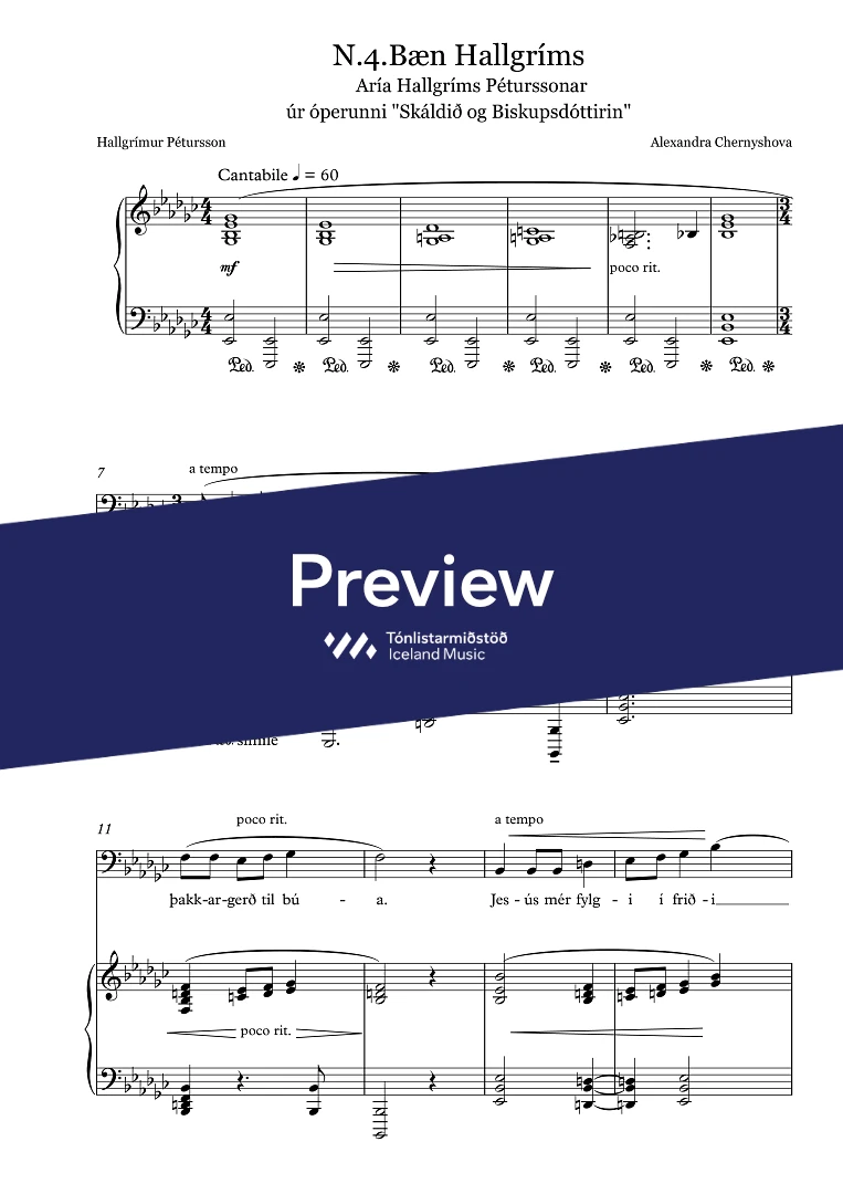 From the book "14 arias from the opera "The Poet and the Bishop's Daughter". First performed in the Kaldalón Hall, Reykjavík, October 2015, by Alexandra Chernyshova, soprano & Helga Bryndís Magnúsdóttir. The complete opera was premiered in 2014. Supported by funds from the Icelandic Musician's Union and the Society of Icelandic Musicians.
