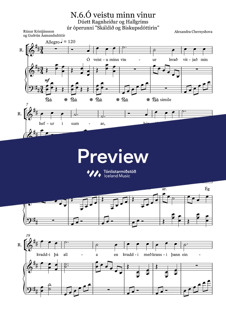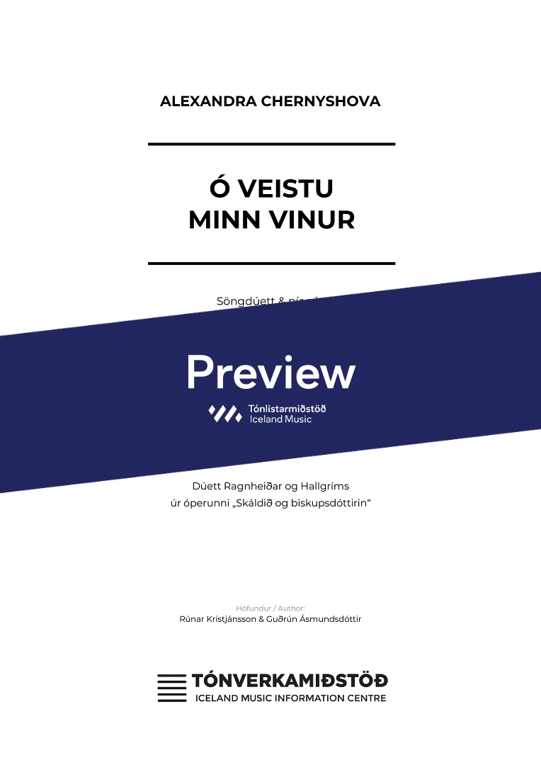 From the book "14 arias from the opera "The Poet and the Bishop's Daughter". First performed in the Kaldalón Hall, Reykjavík, October 2015, by Alexandra Chernyshova, soprano & Helga Bryndís Magnúsdóttir. The complete opera was premiered in 2014. Supported by funds from the Icelandic Musician's Union and the Society of Icelandic Musicians.
