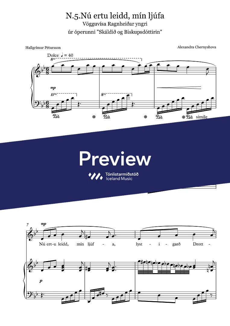 From the book "14 arias from the opera "The Poet and the Bishop's Daughter". First performed in the Kaldalón Hall, Reykjavík, October 2015, by Bylgja Dís Gunnarsdóttir, soprano & Helga Bryndís Magnúsdóttir. The complete opera was premiered in 2014. Supported by funds from the Icelandic Musician's Union and the Society of Icelandic Musicians.
