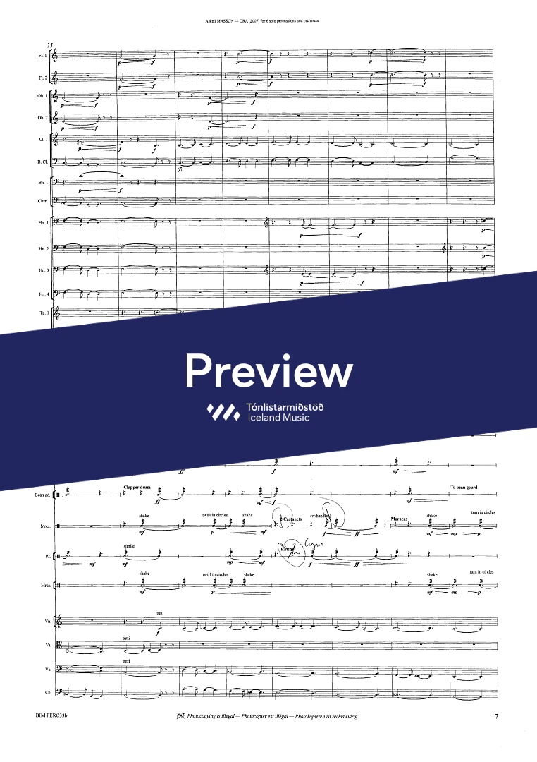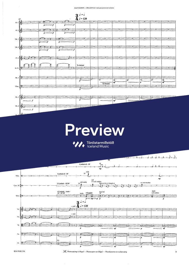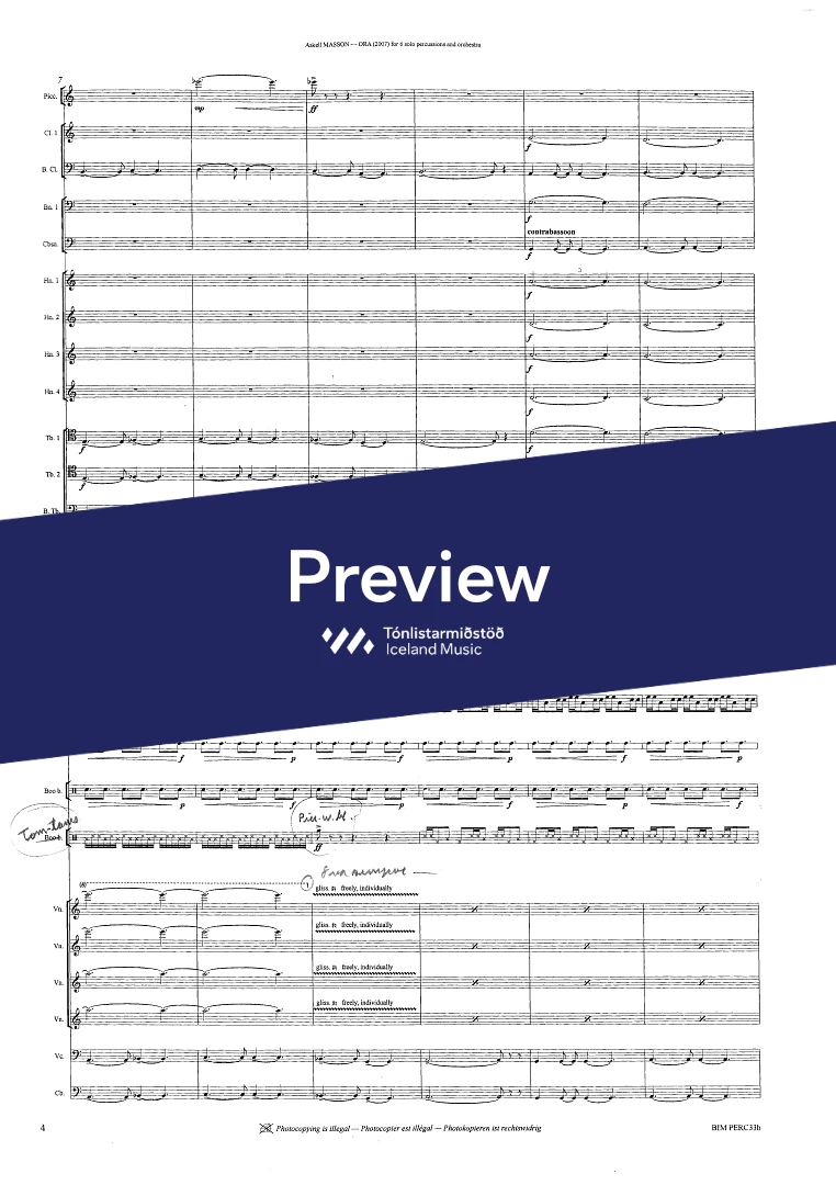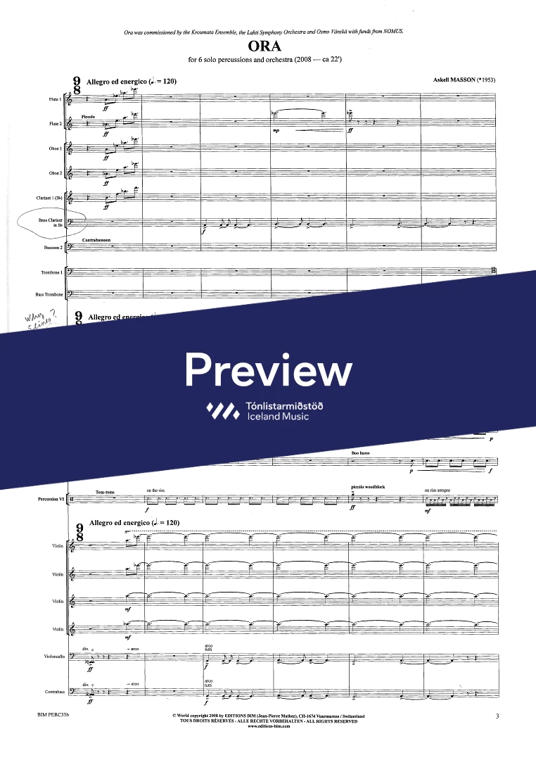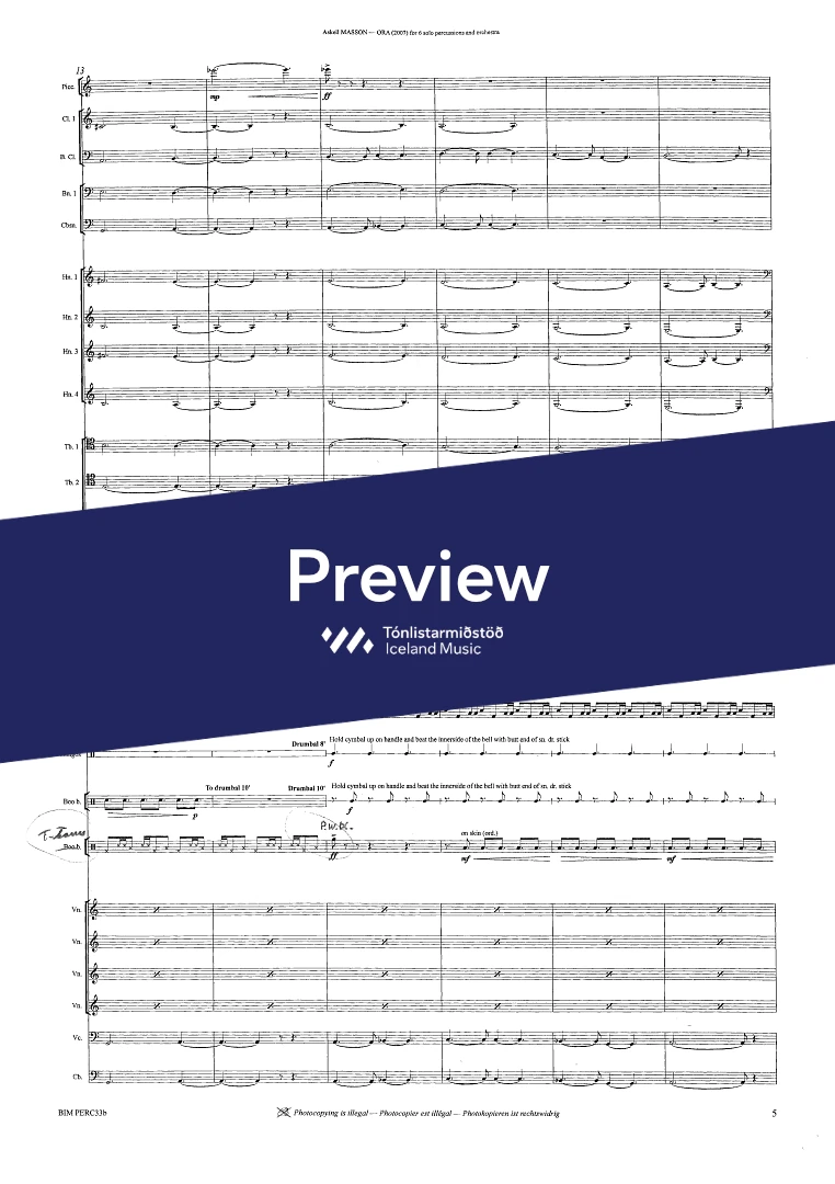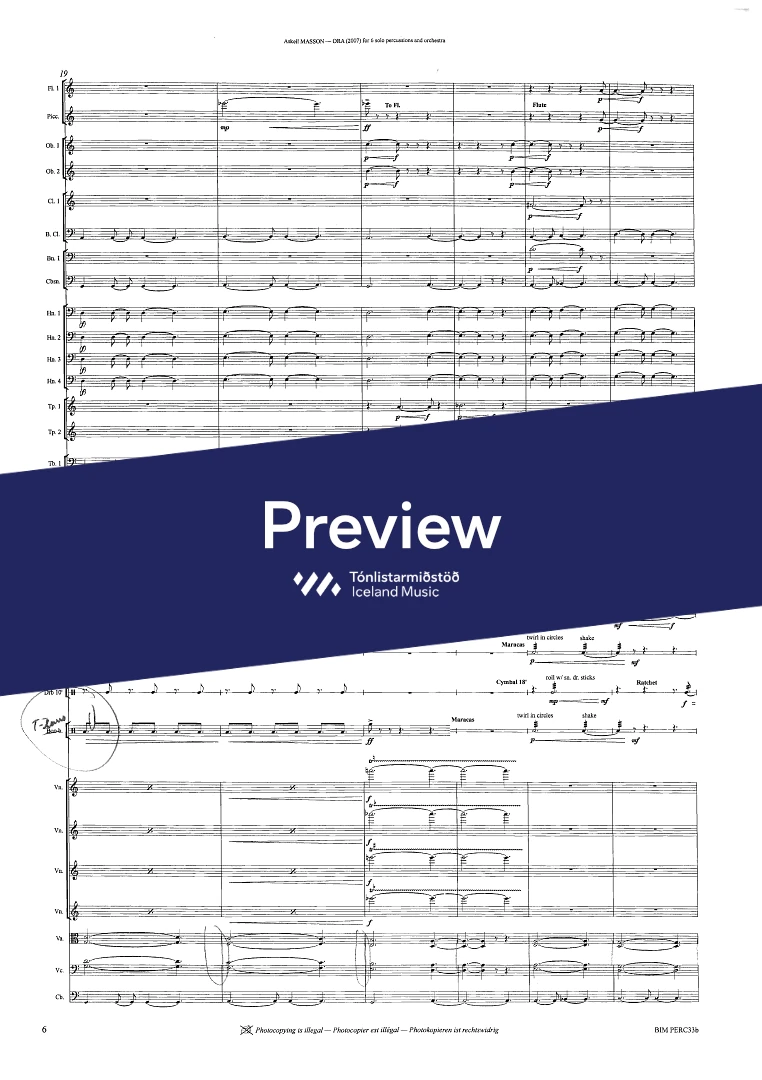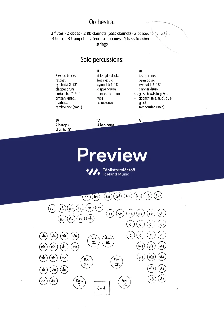 2,2,2(Bcl.)2,(Cbn) - 4,3,3,0 - str. - 6 solo percussionists