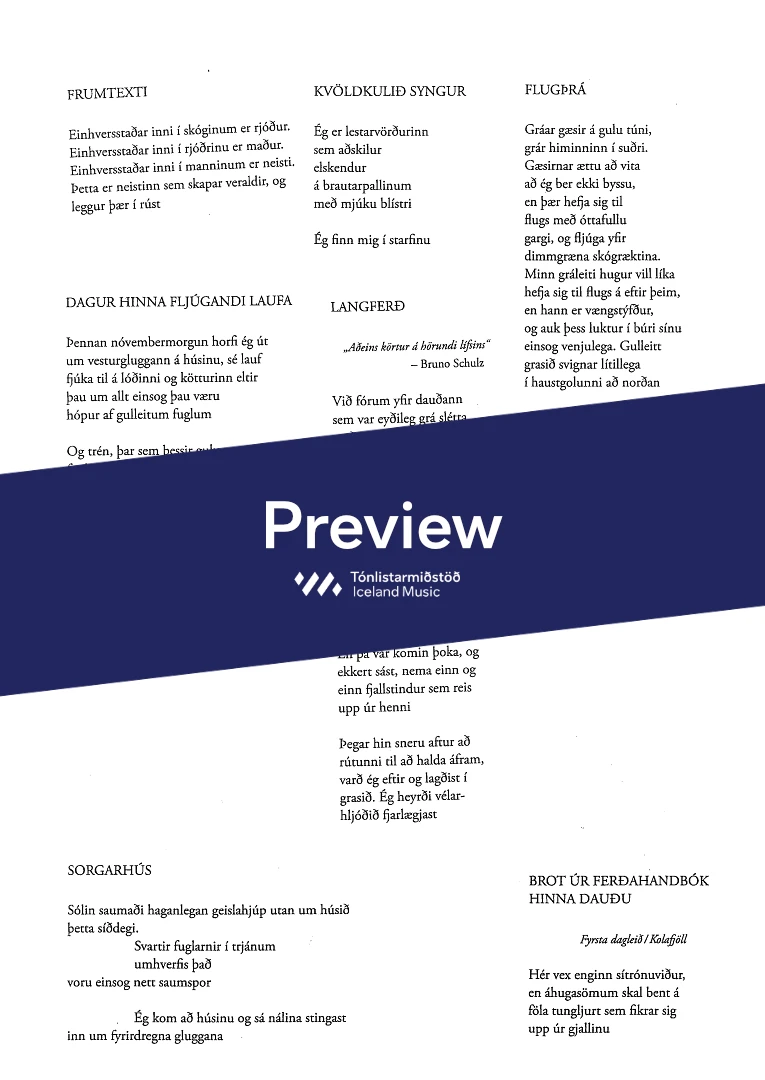 InstrumentationFlute, Piccolo Flute, Alto Flute, Bass Clarinet, Percussion, Piano, Mezzo-soprano, Boy Soprano, Violin, Viola, Cello