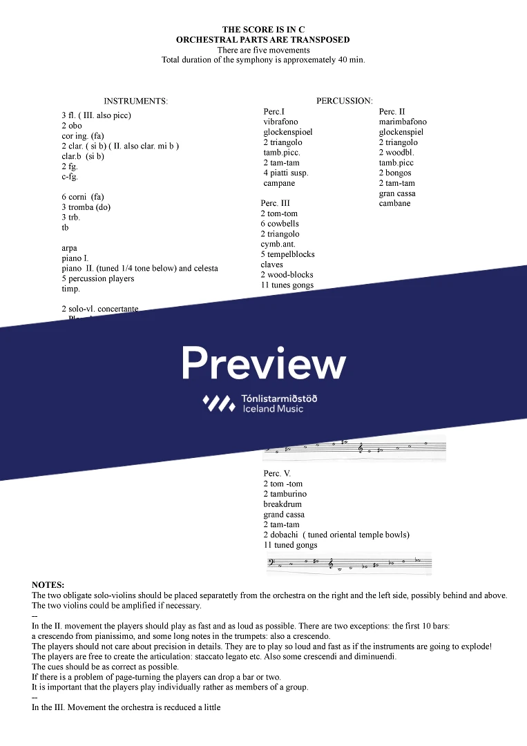 Instrumentation 3fl.2ob.con.ing.2cl.Bcl.2fg.cfg - 5hrn.3trb.3trp.tub. - harp.2pno.5perc.timp. 2 solo.vln.str.