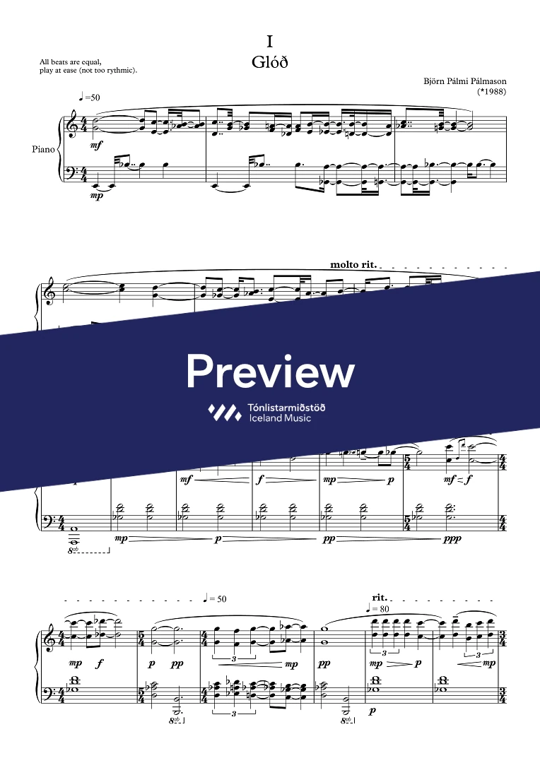 Composer Björn Pálmi Pálmason Year composed2018 Categories Solo works InstrumentationPianoDuration40 minutes Catalogue no.150-002 ISMN-