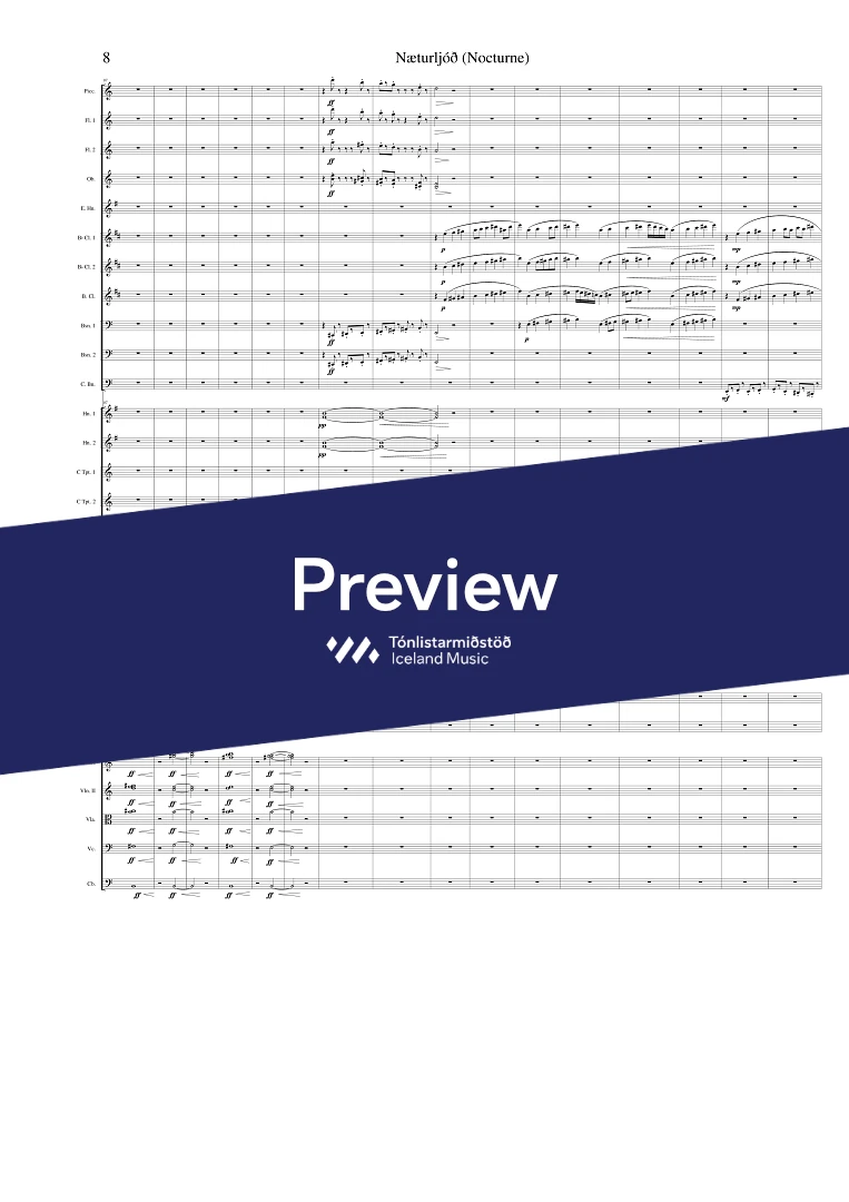 Instrumentation 2(+picc.),2(+C-A.),2+(Bcl.),2(+Cbsn.) - 4,3,2,1, - tmp. - perc(2). - hp. - str.