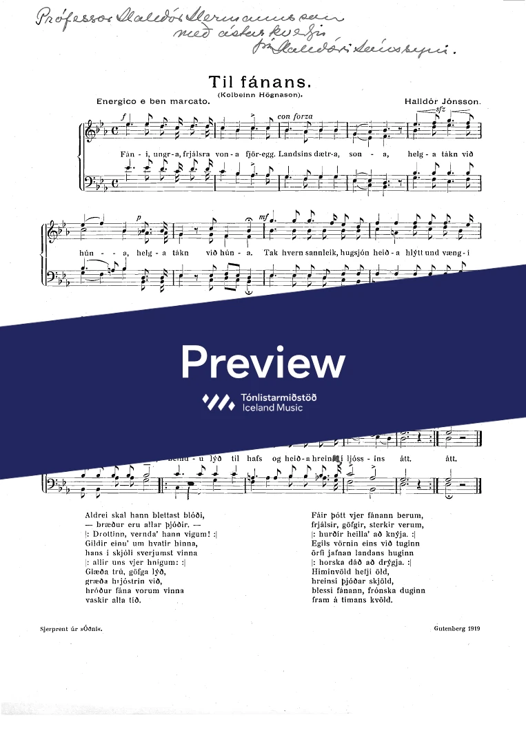 Text sampleFáni, ungra, frjálsra vona fjöregg landsins dætra, sona,