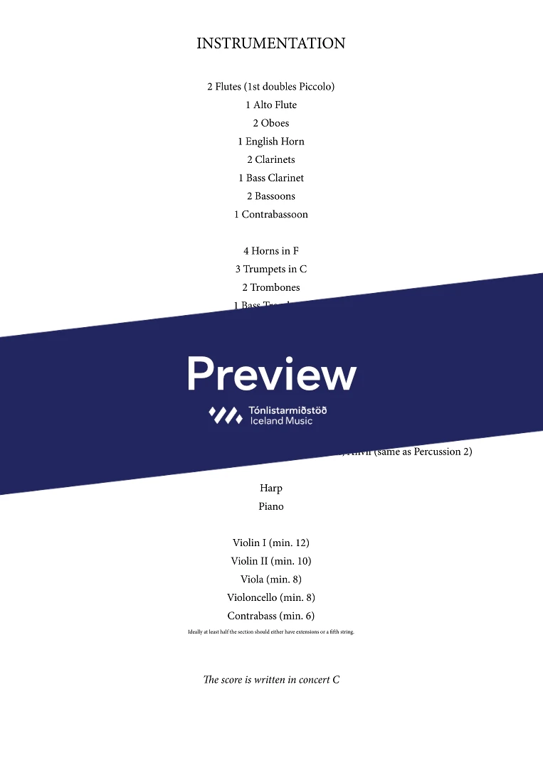 Instrumentation 3(picc. alto).3(EH).3(Bcl.).3(Dbsn) - 4.3.3(bass).1 - perc. (4) - harp - pf - strings