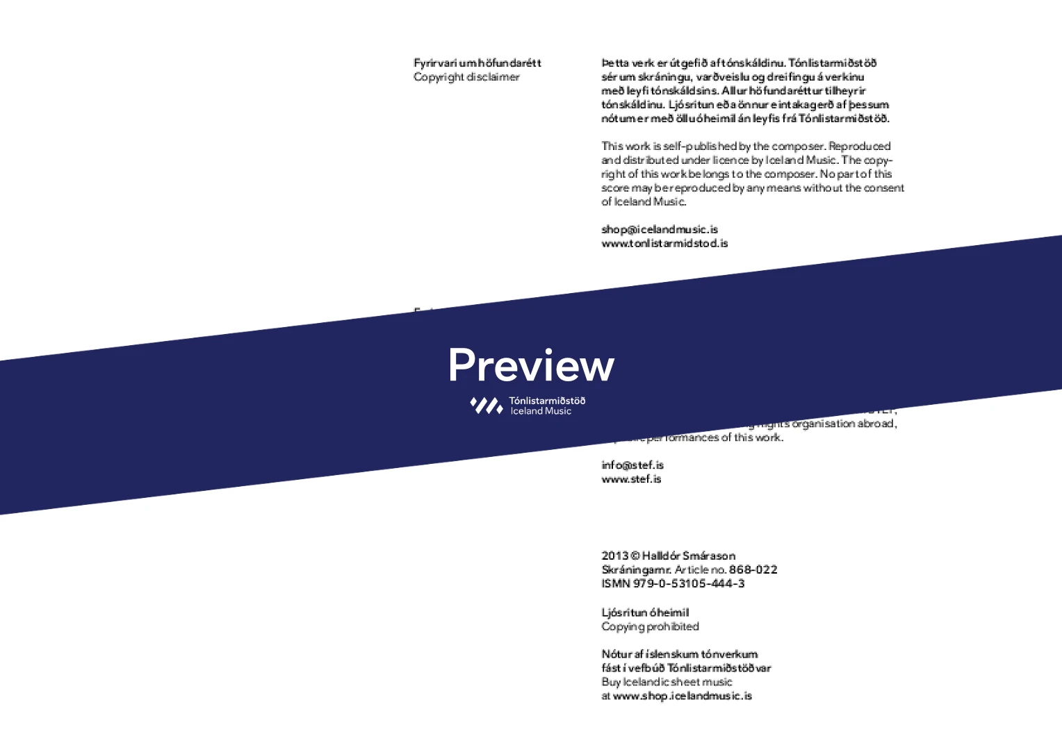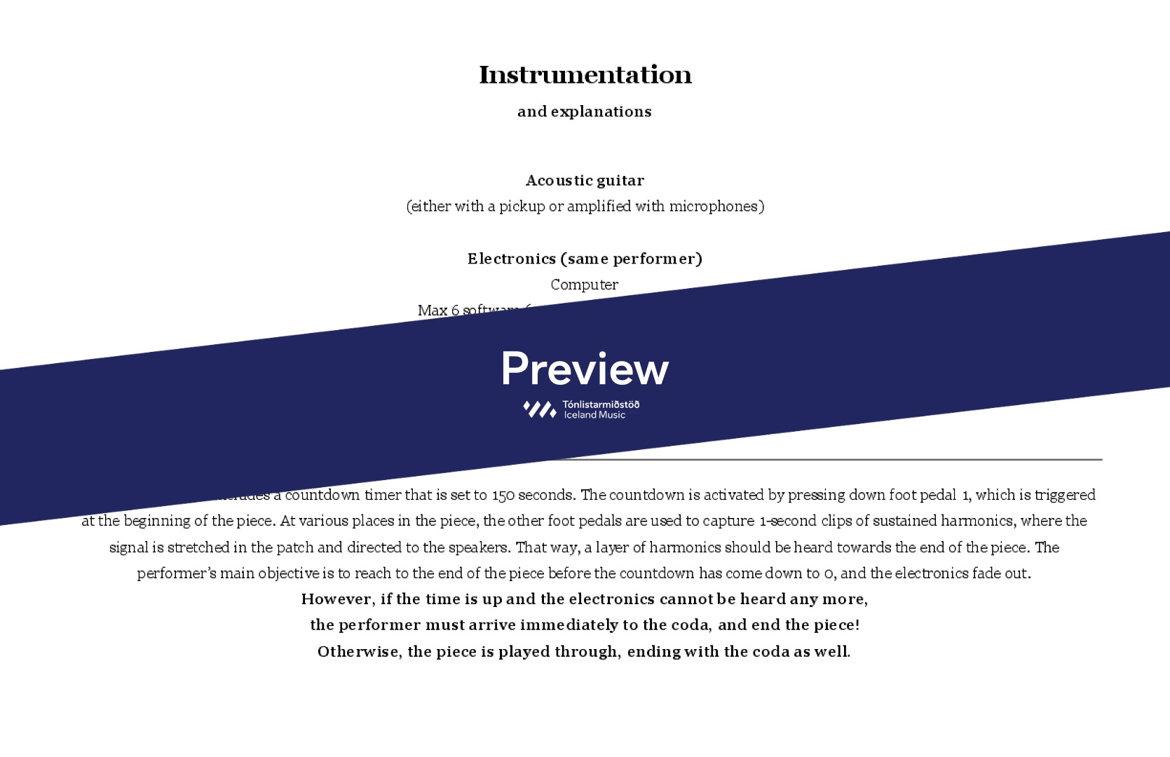 The instrument is either with a pickup or amplified with microphones. The electronics are controlled by the player and for this is required a computer, Max 6 software (patch provided by the composer), Midi foot pedal, Stereo speakers, appropriate cables. (Note: minimum two condenser microphones if the guitar does not have a pickup). Price is for score only. Fo electronics contact shop@icelandmusic.is