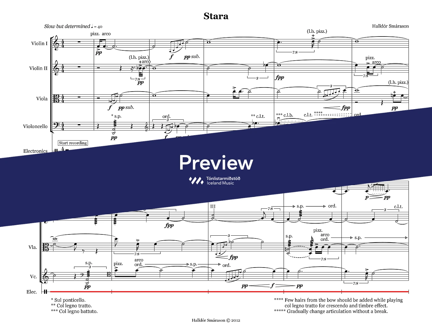 First performance: 19 November 2012 in Manhattan School of Music, New York, NY, USA. Performers: Holly Jenkins and Benjamin Sutin, violin, Nicholas Pauly, viola, Vivian Chang, cello, Robert Karpay, electronics. Dedicated to Helga Friðriksdóttir.