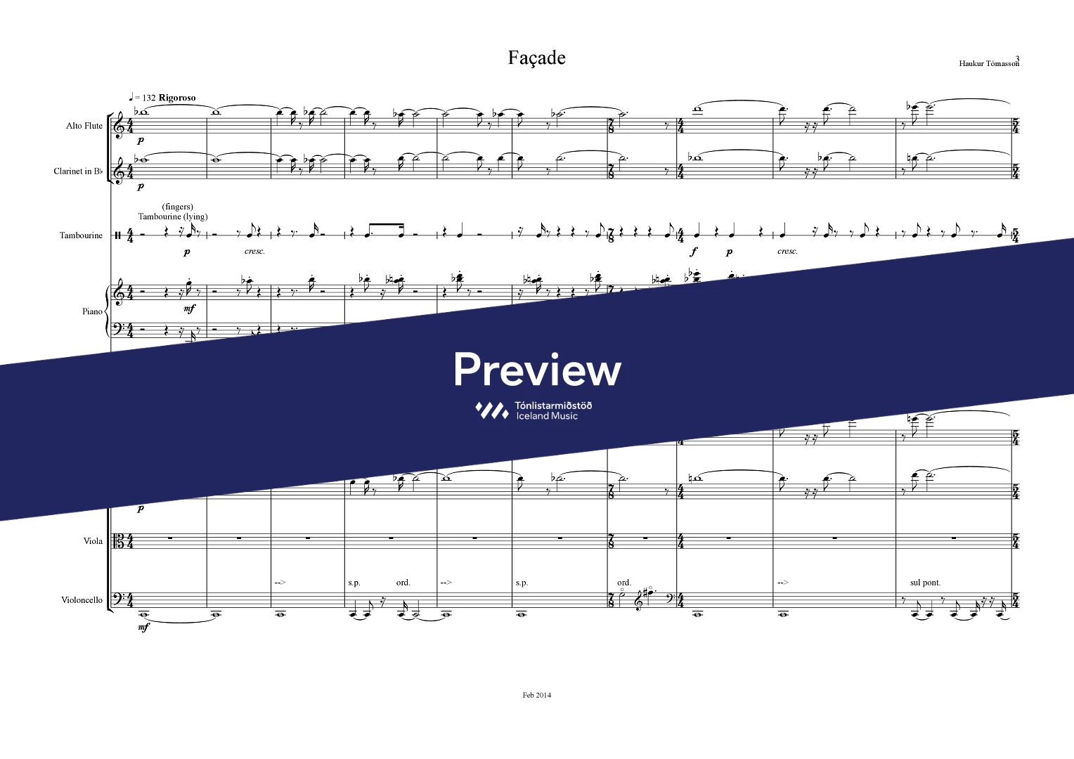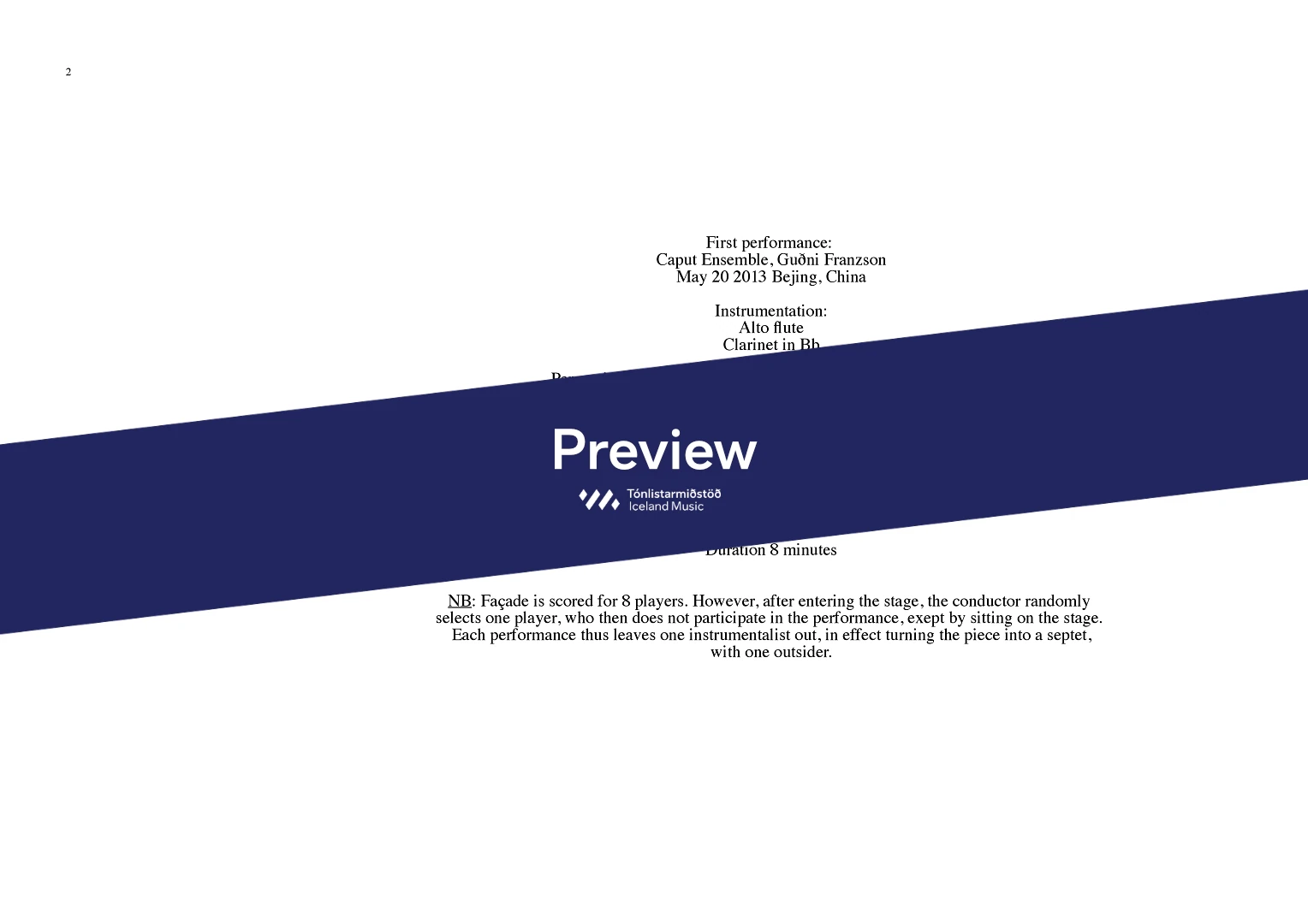 "Nota bene: "Façade" is scored for 8 players. However, after entering the stage, the conductor randomly selects one player, who then does not participate in the performance, exept by sitting on the stage. Each performance thus leaves one instrumentalist out, in effect turning the piece into a septet, with one outsider."