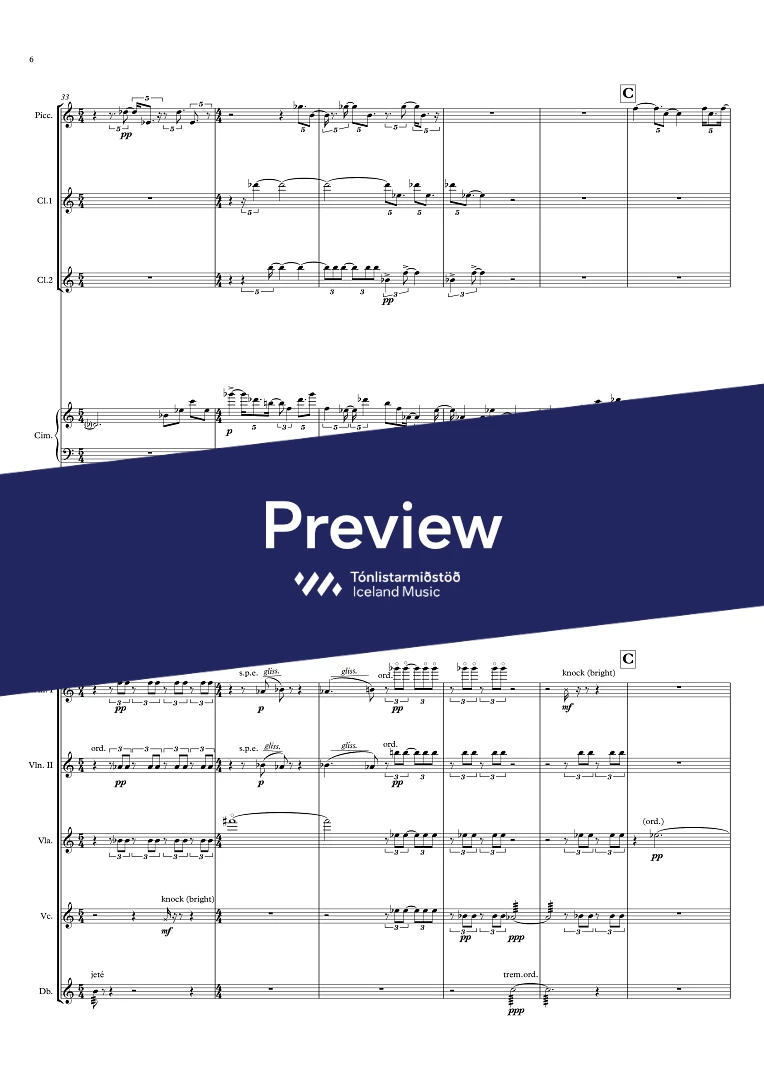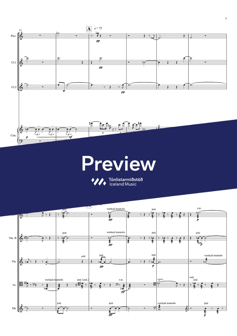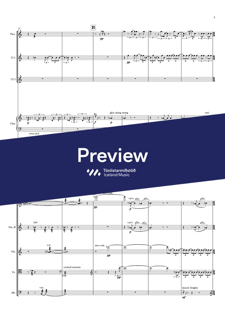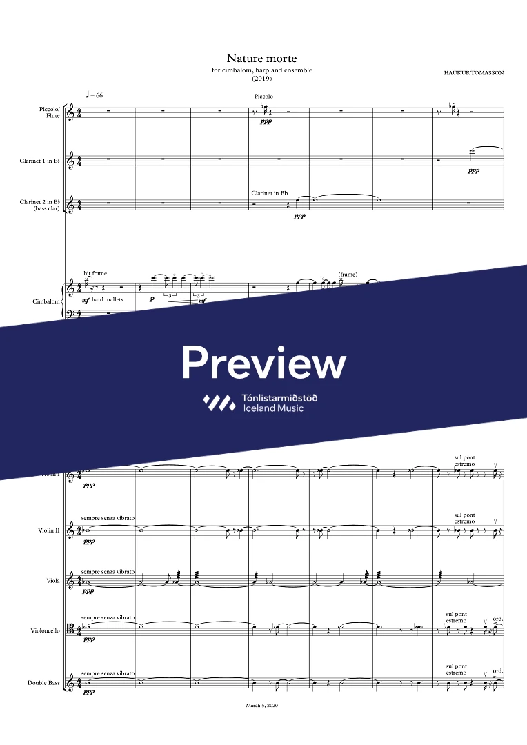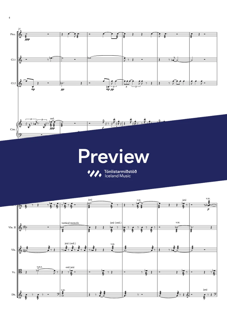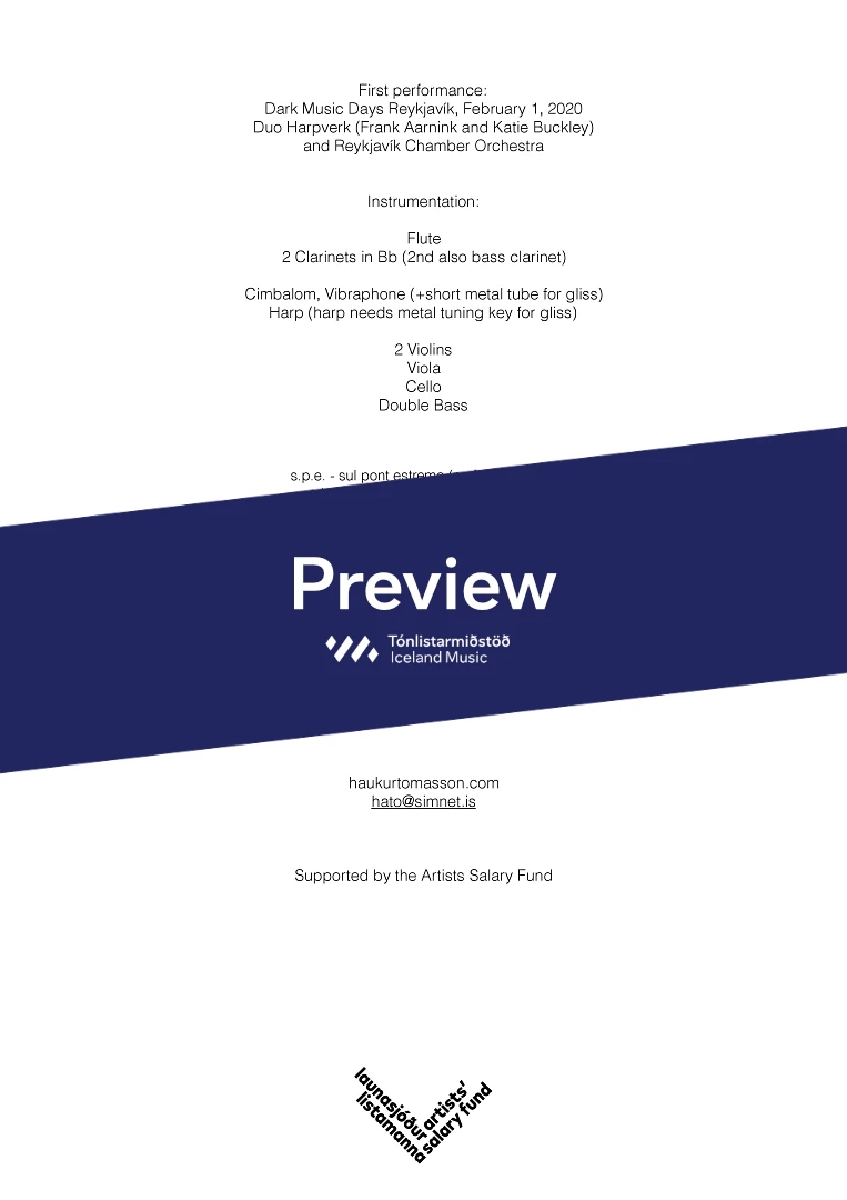 Instrumentation Flute/Piccolo, 2 Clarinets (2nd also Bass-clarinet), Cimbalom/Vibraphone, Harp, 2 Violins, Viola, Cello, Double-Bass