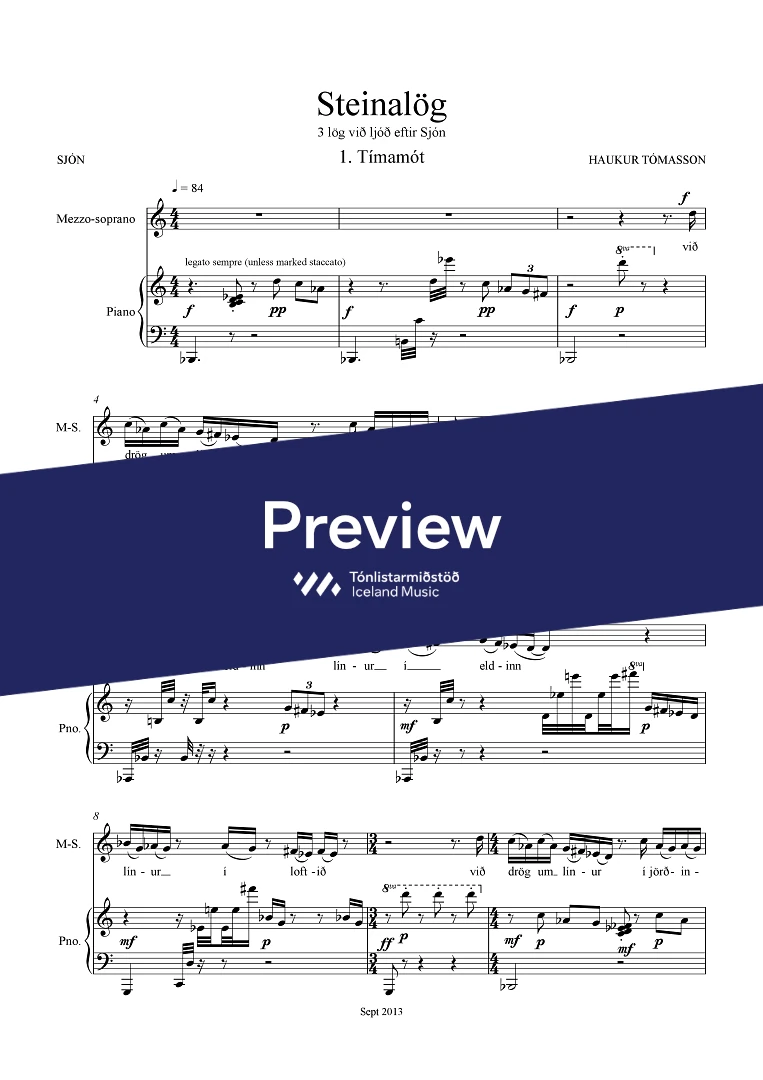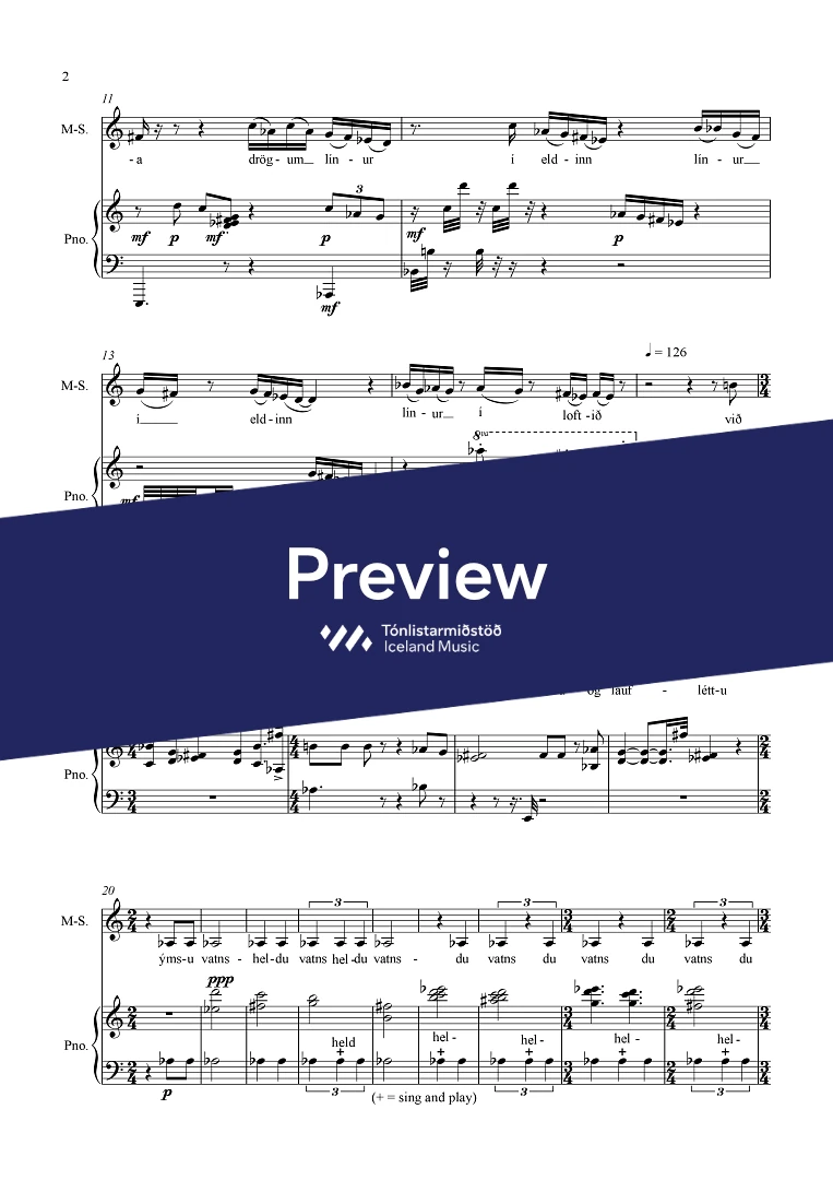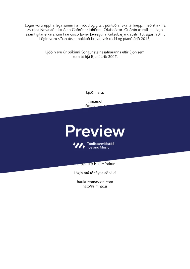 Originally composed for voice & guitar, the work was supported with funds from (amongst others) Musica Nova. First performance: 13 August, 2011 by Gúðrún Jóhanna Ólafsdóttir and guitarist Francisco Javier Jáuregui.