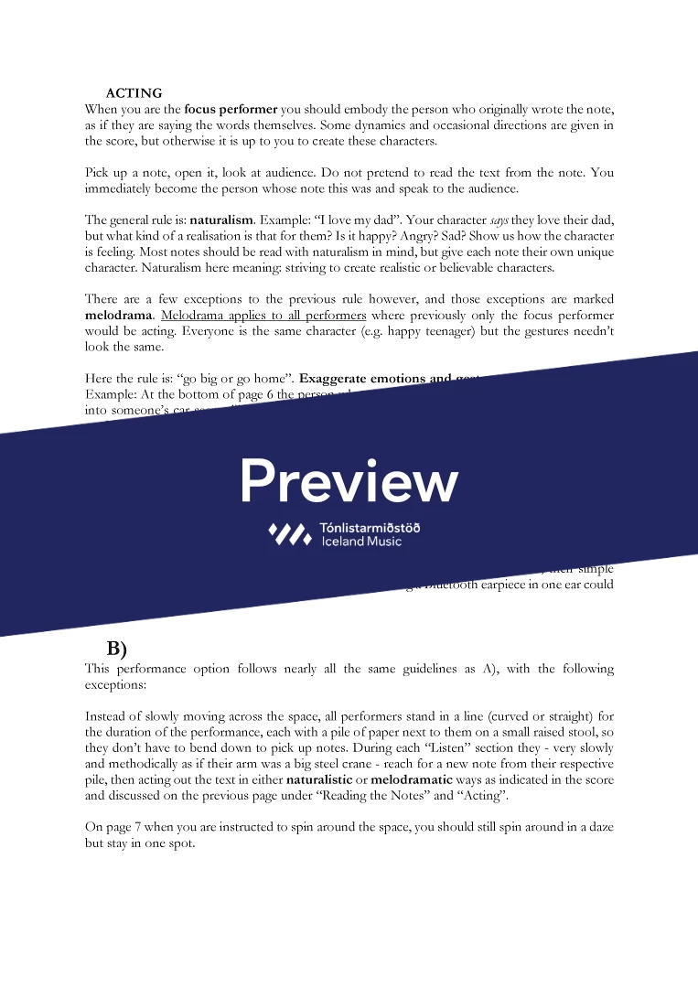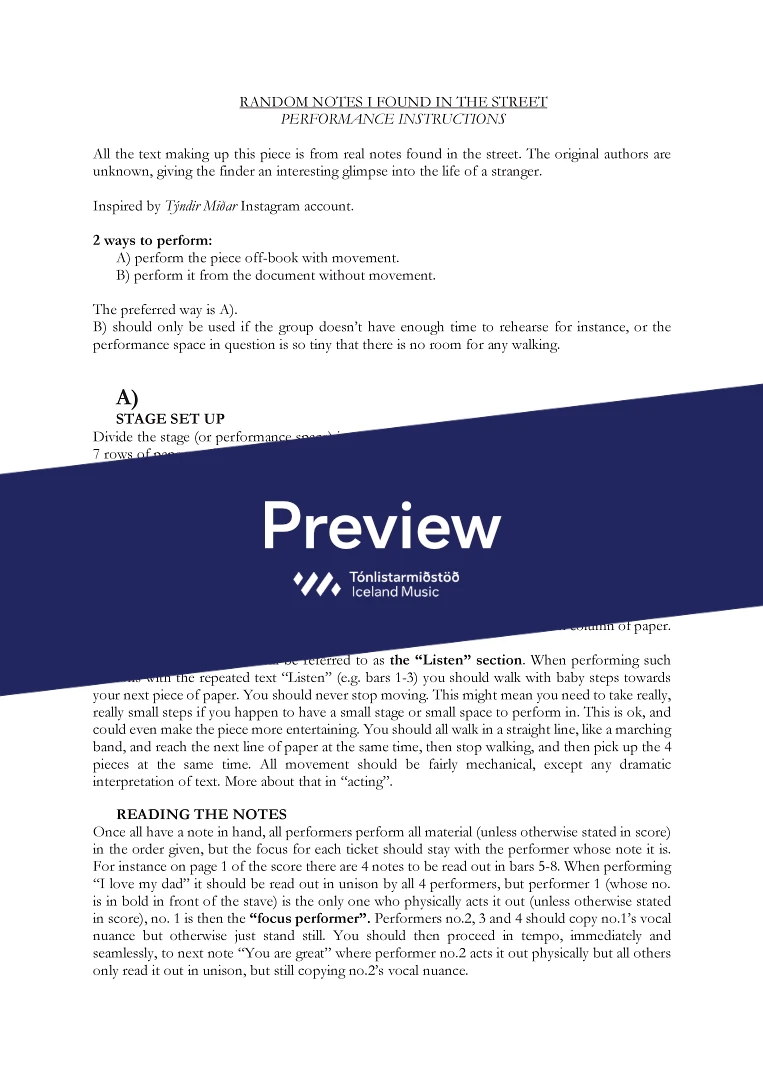 Random notes I found in the street, or Random notes for short, is a playful performance piece that requires impressive rhythmic and dramatic synchronisation between four performers. All the text is from real notes found by chance around my city, written by real people. Their content varies dramatically, one simply saying “I love my dad”, while another scolds coworkers for not cleaning the microwave after use. While the original authors of the texts are unknown, they give us a glimpse into the life of strangers. Inspired by Týndir Miðar (Lost Notes) Instagram account