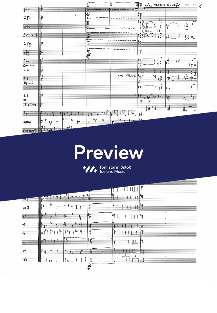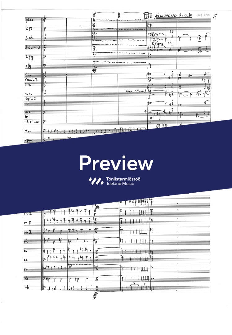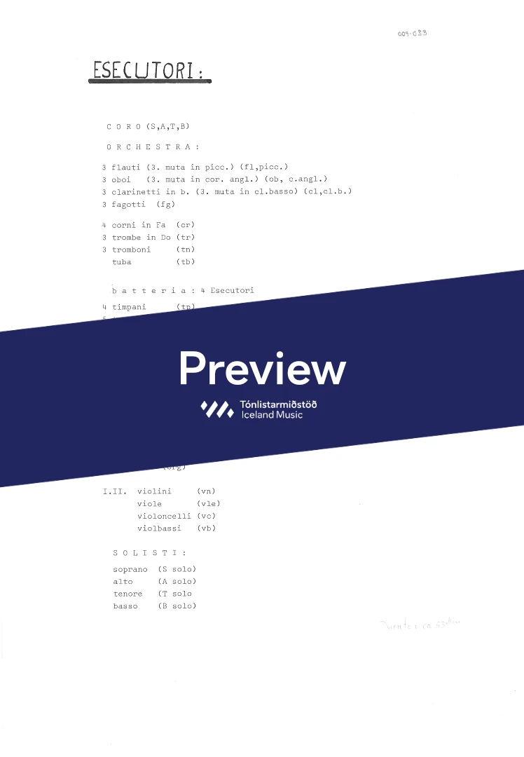 3(3picc),3(3eh),3(3Bkl.)3-4,3,3,1- - perc.(4) - cel. -org. - str. - choir (SATB) soprano, alto, tenor bass soloists