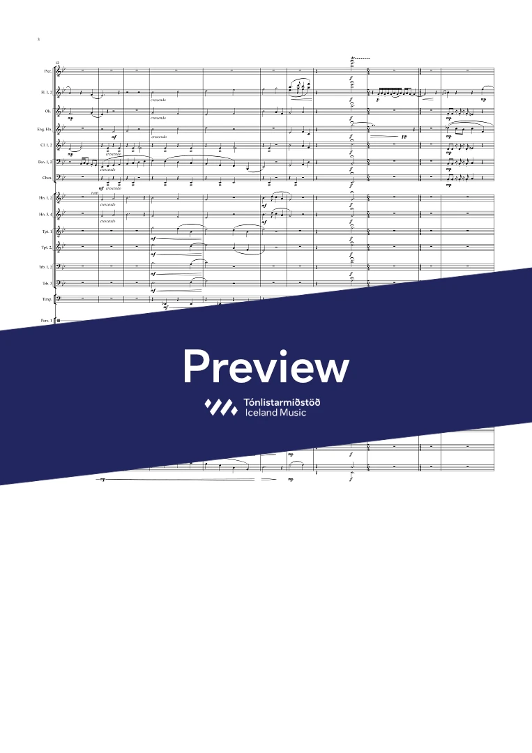 3(picc).2(EH).2.3(Cbsn) - 4.2.3.0 - timp. - perc(2) - pf - harp - strings