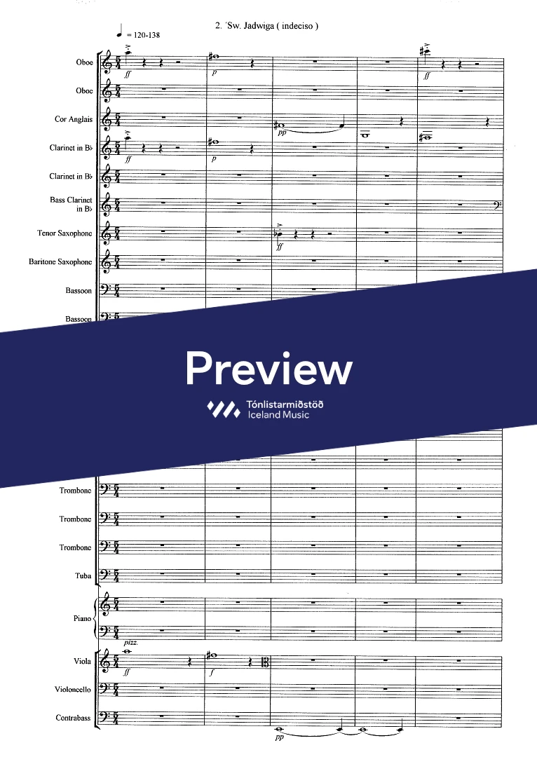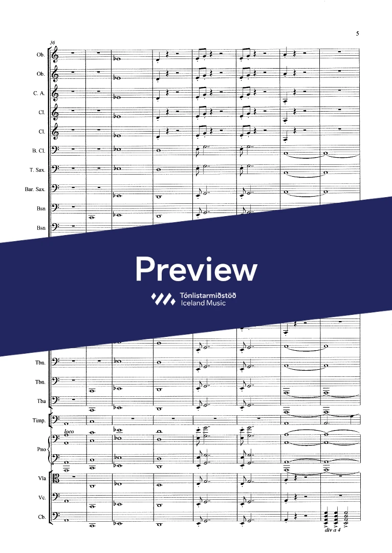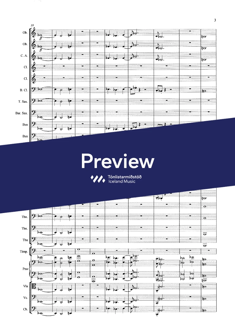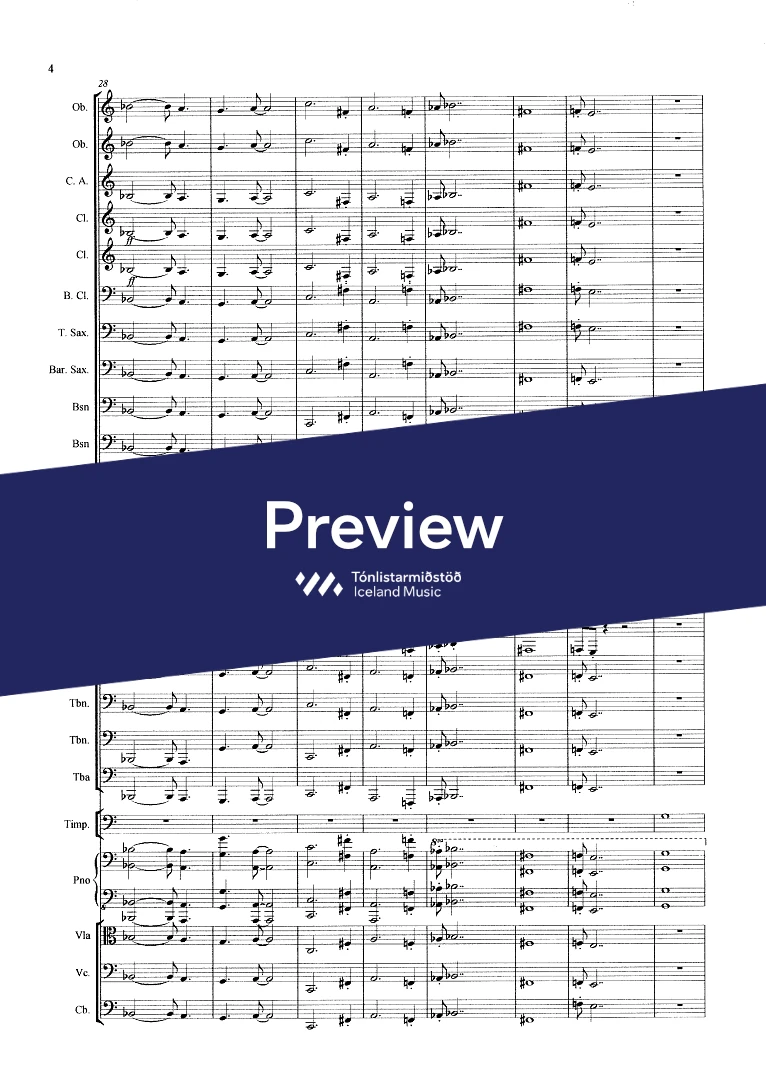 Instrumentation 2,2(c.ang)3(bcl.) ten. sax. bar.sax. 3(cbn) - 4,0,2,1 - tmp. - pno solo - str. (no violins)