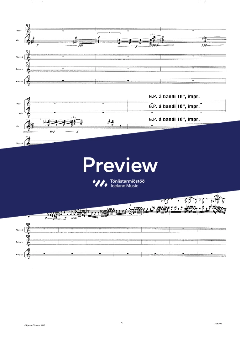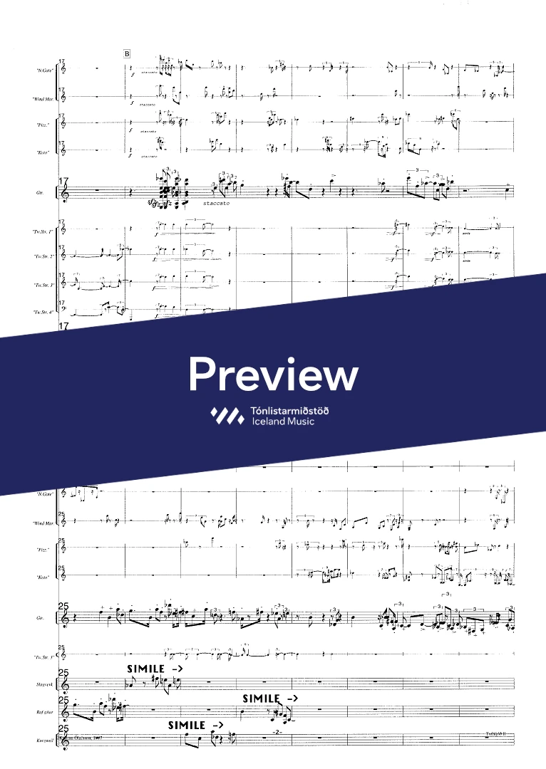 2(picc.),0,4(Bcl, Eb-kl.,)0 - 0,1,0,0, - slv.(2) -pno.(2), guit. - vln.(2),vla., Db.