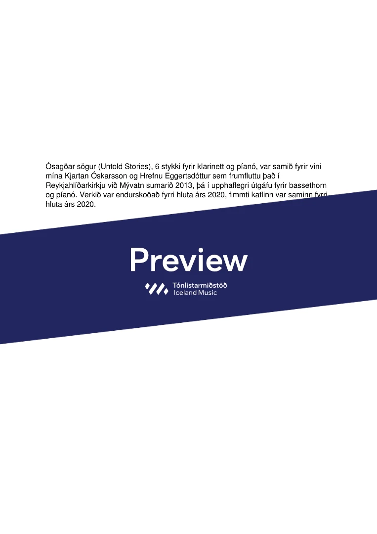 The composer writes: "Ósagðar sögur, Untold Stories, six pieces for Clarinet in B-flat and Piano, was written for my friends Kjartan Óskarsson and Hrefna Eggertsdóttir who premiered it in the summer of 2013, in its original version for basset horn and piano. The piece was substantially revised in the early months of 2020."