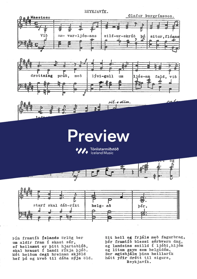 Composer Ólafur Þorgrímsson Year composed- Text sampleVið sævarljómans silfurskrúð Categories Choral music Catalogue no.752-005 ISMN-