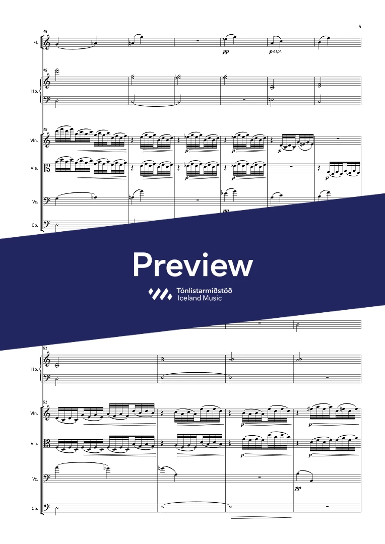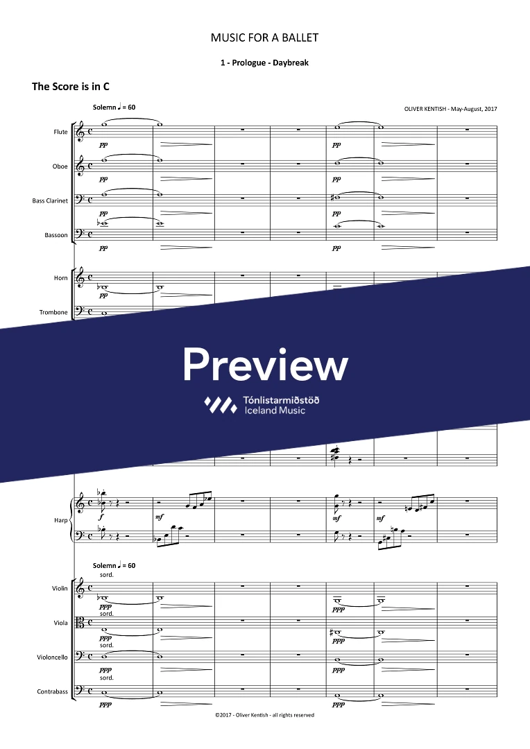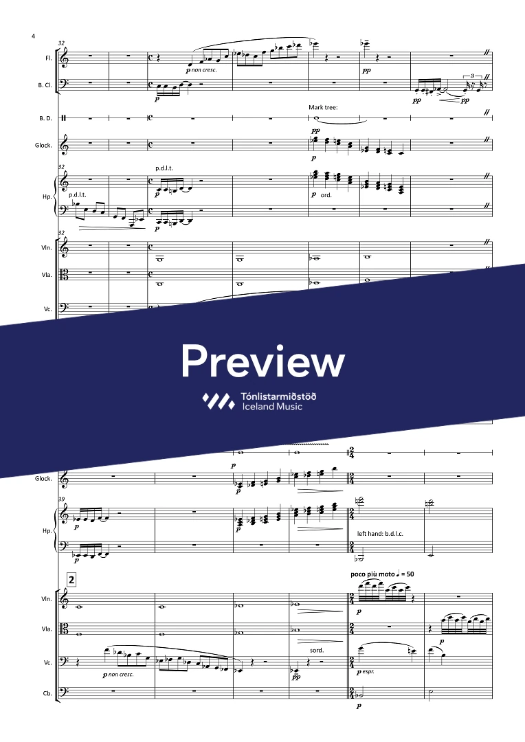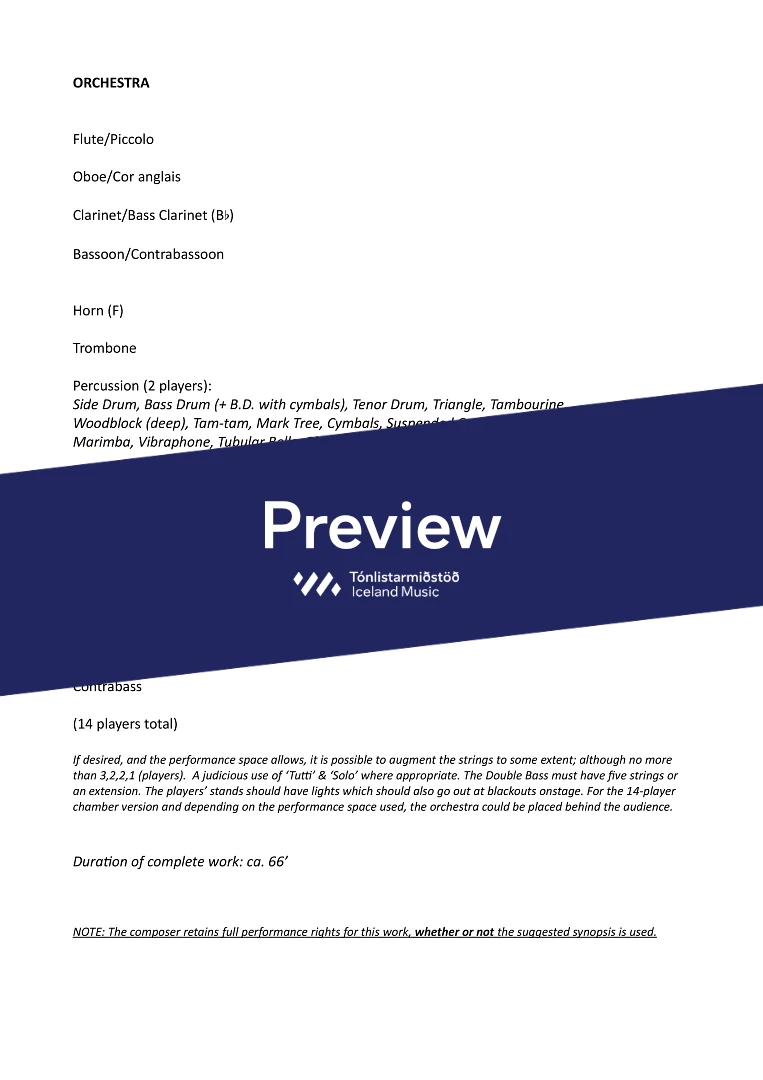 Instrumentation flute/picc., oboe/cor-anglais, clarinet/bass-cl. bassoon/contrabassoon, horn(F), trombone, Perc.(2), Harp, Piano, Violin, Viola, Cello, Bass