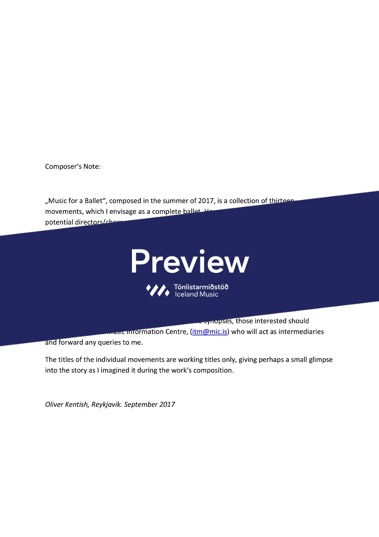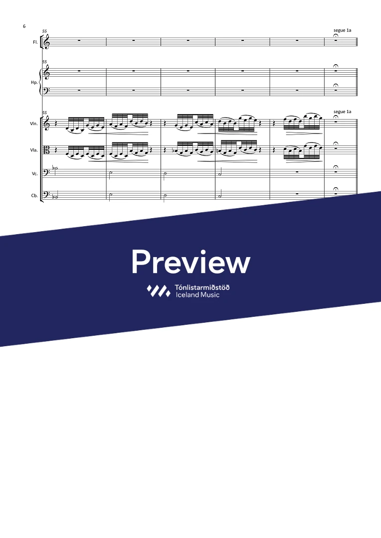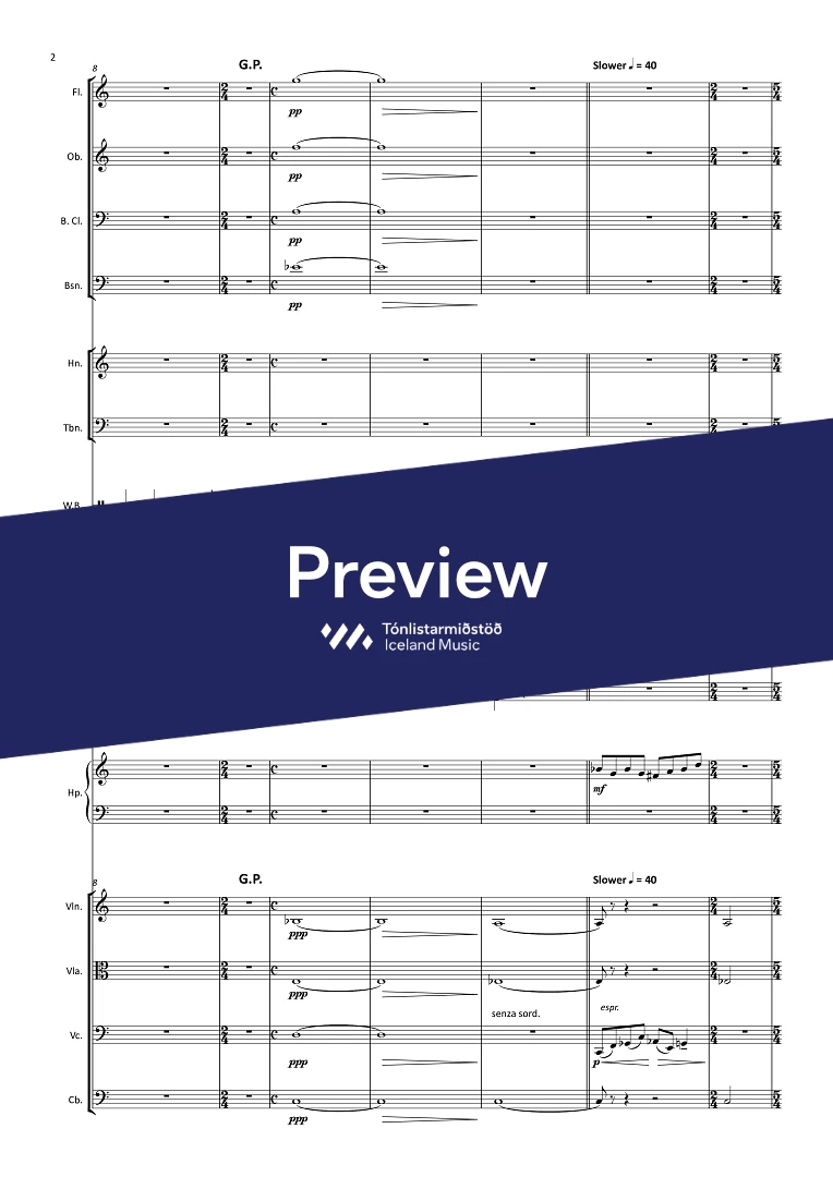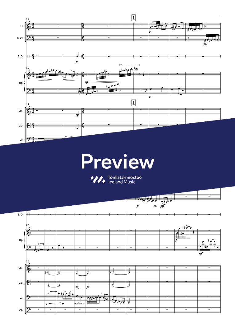 Instrumentation flute/picc., oboe/cor-anglais, clarinet/bass-cl. bassoon/contrabassoon, horn(F), trombone, Perc.(2), Harp, Piano, Violin, Viola, Cello, Bass