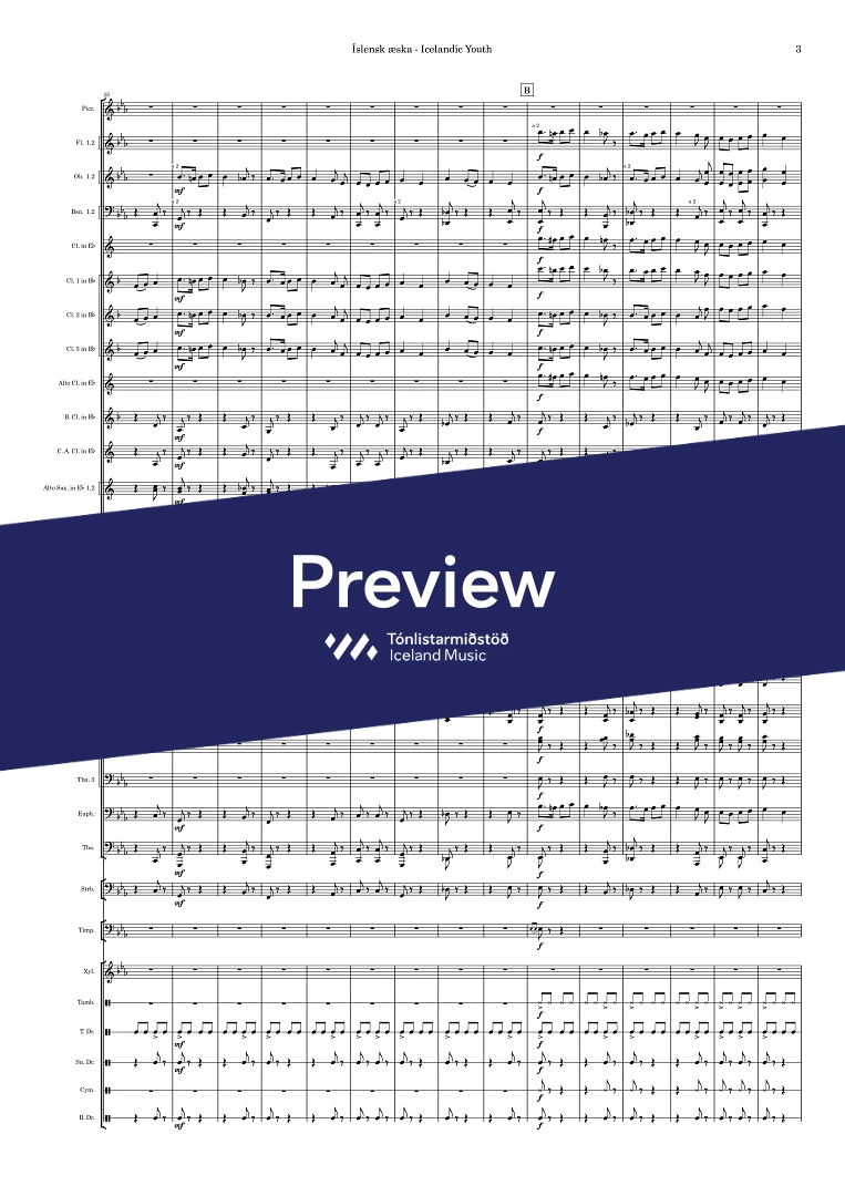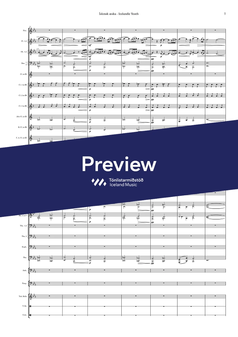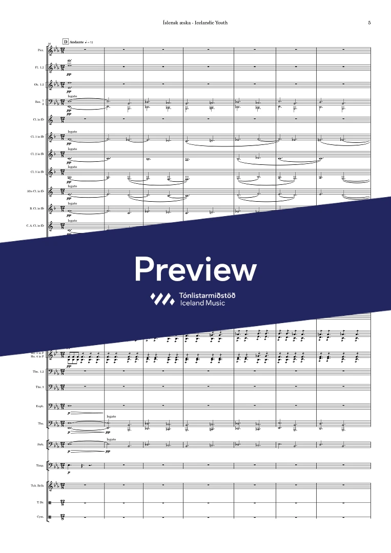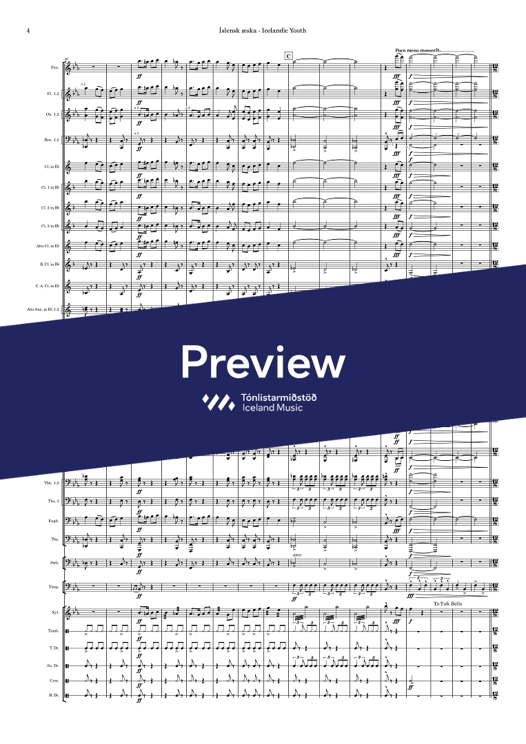 2+picc.2,3+eBcl., alto-cl.(Eb) Contra Alto cl. (Eb) A.Sax.(2)Ten.Sax. Bar.Sax.Horn(4) Cornet (Bb-3)Tpt. (Bb-2) Tbn.(3) Euph. Tba. D.bass, tmp. perc.