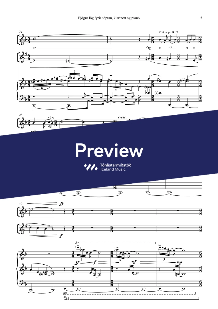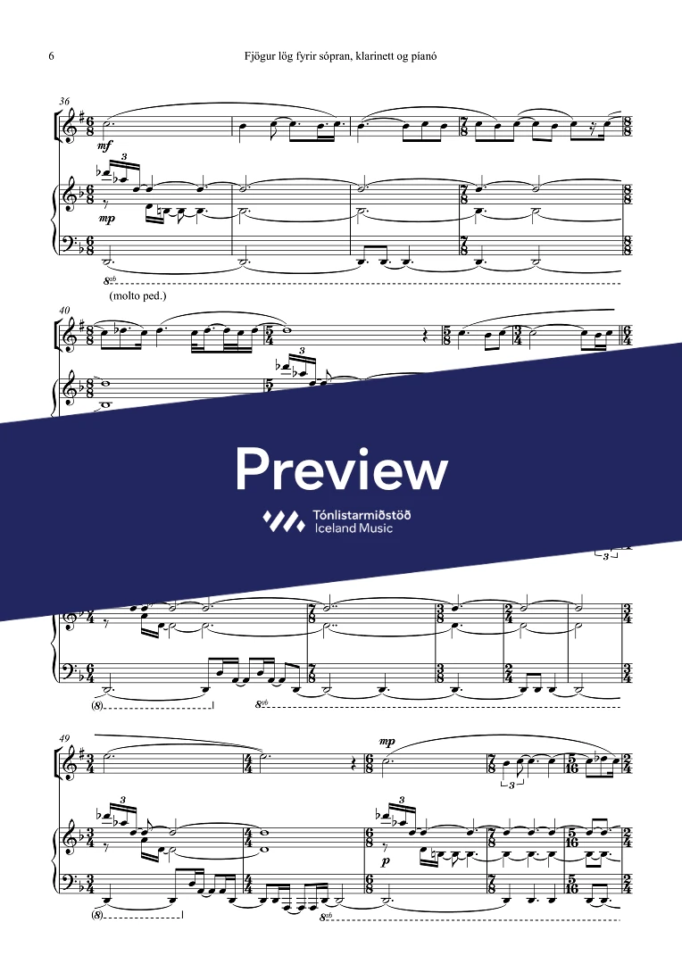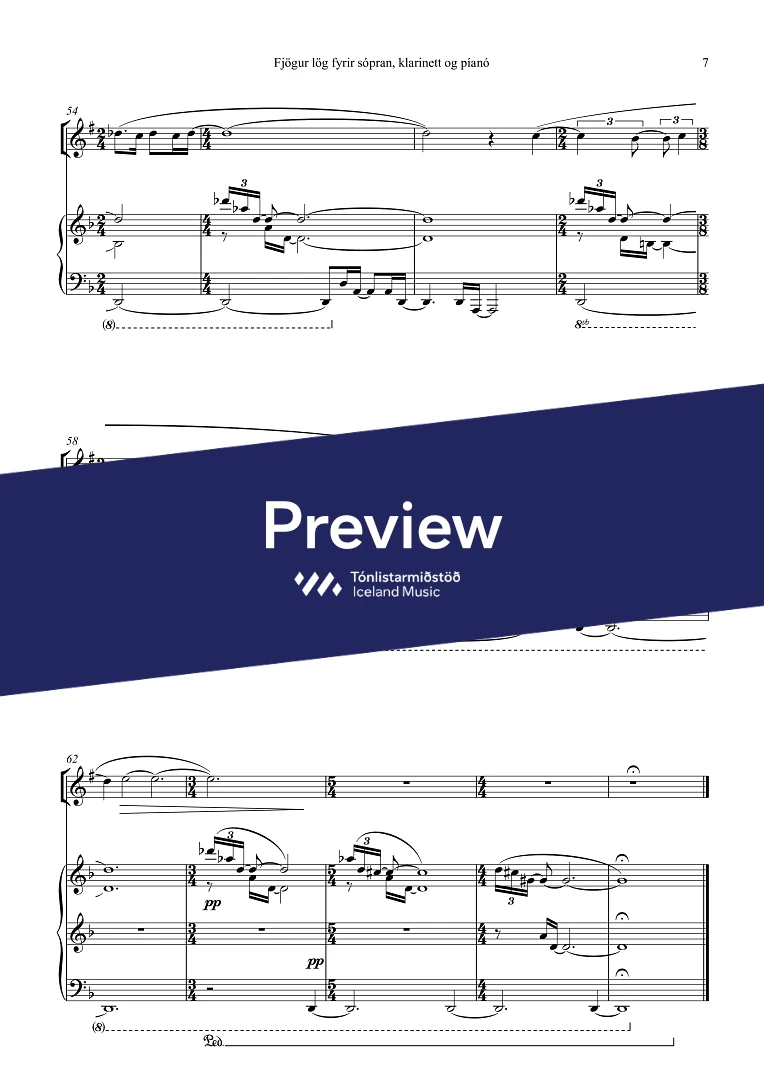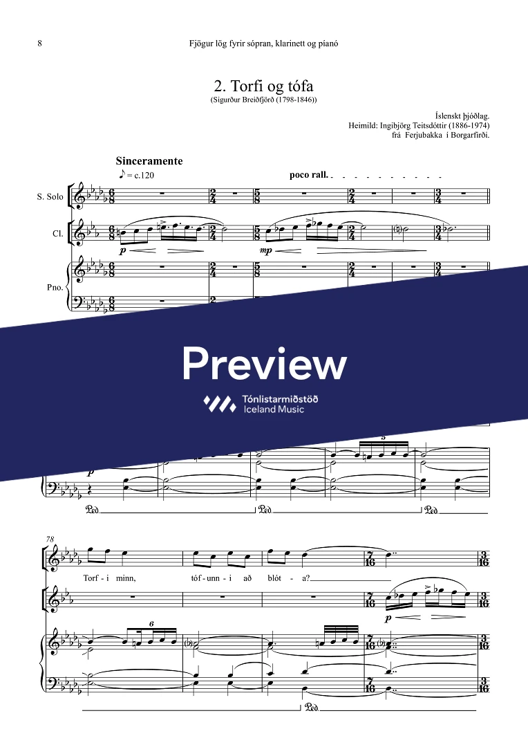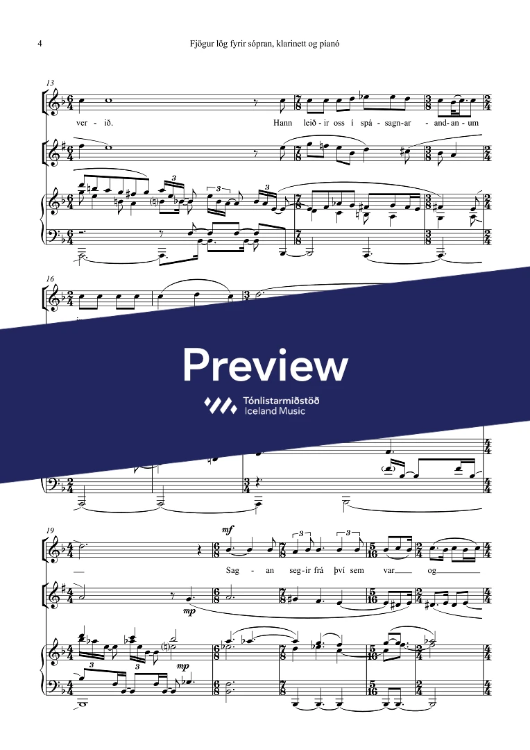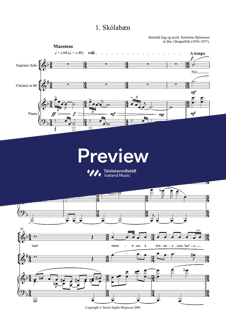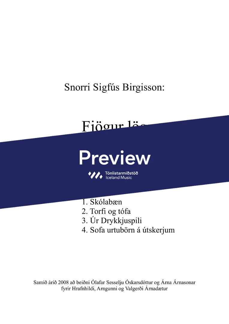 This work was composed in 2008 at the request of Ólöf Sesselja Óskarsdóttir and Árni Árnason for their daughters, Hrafnhildur (Soprano), Arngunnur (Clarinet) and Valgerður (Piano) who premiered the work on February 14th 2009 in Reykjavík. The 1st movement is a School Prayer (for a new school in a new place), the 2nd movement is about a man called Torfi who is urged not to speak ill of the fox even though it had killed one of his sheep. The 3rd movement urges moderation when drinking ale and the 4th movement is a Lullaby. The first three movements are based on Icelandic folk songs but the last movement is a variation on a song by Jón Laxdal (1865-1928).