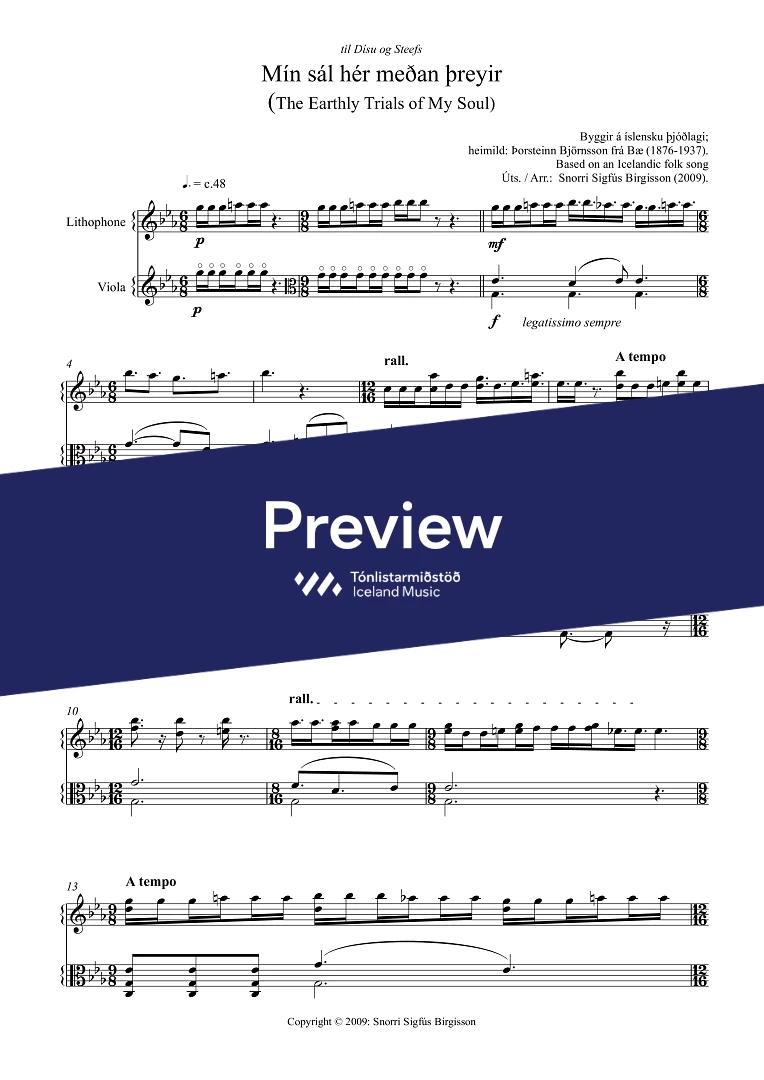Mín sál hér meðan þreyir / The Earthly Trials of My Soul is an arrangement for Viola & Lithophone specially made for and dedicated to Herdís Anna Jónsdóttir (Viola) and Steef van Oosterhout (Lithophone). The arrangement is based on a recording of a melody sung by Thorsteinn Björnsson (1876-1937).