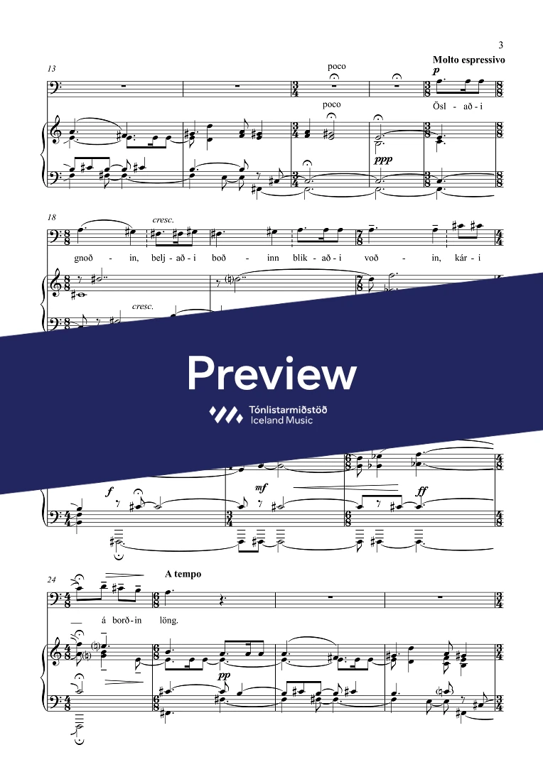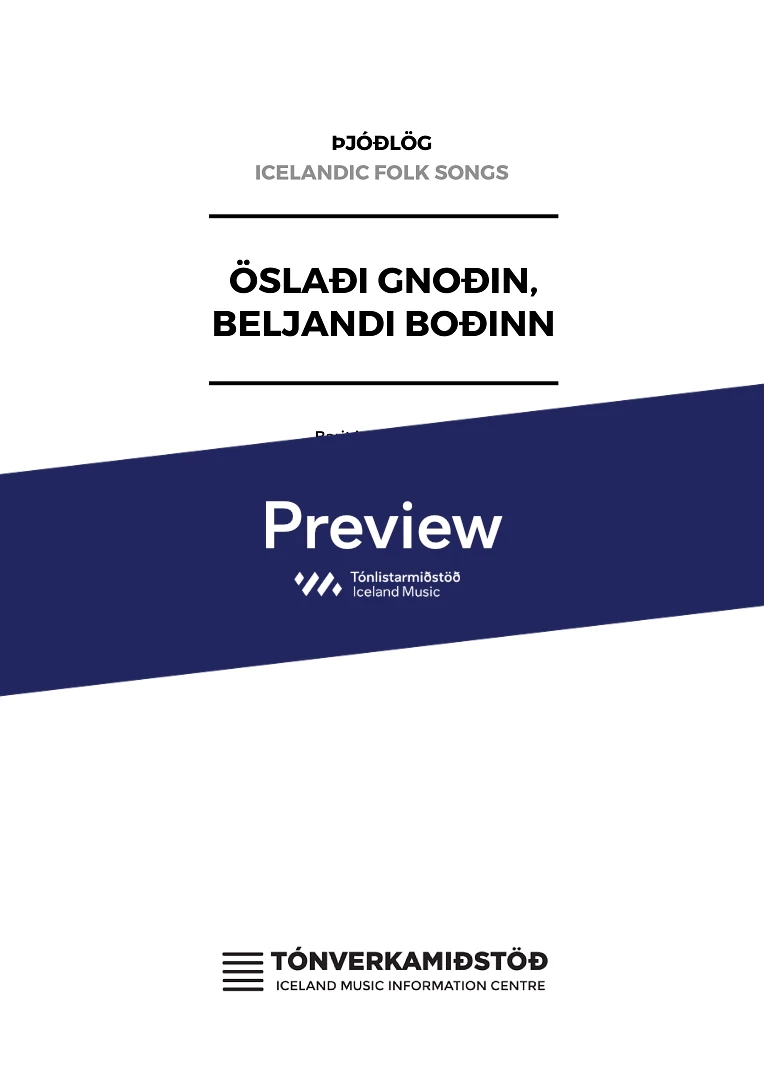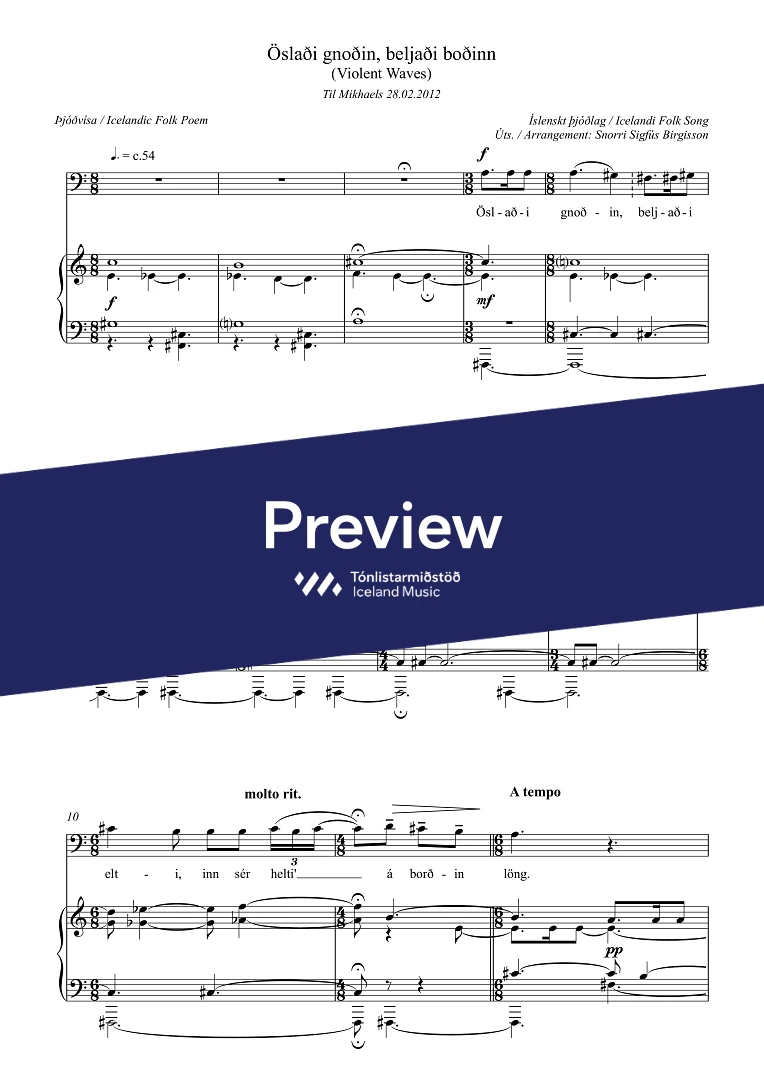 This song was originally arranged for Piano Solo (23 Icelandic Folk Songs for Piano) and then transcribed in 2012 for Mikhael Aaron Óskarsson and dedicated to him on his birthday. He premiered the piece at a school concert in the Song Academy of Sigurdur Demetz in Iceland the same year. The text describes violent winds and waves at sea.