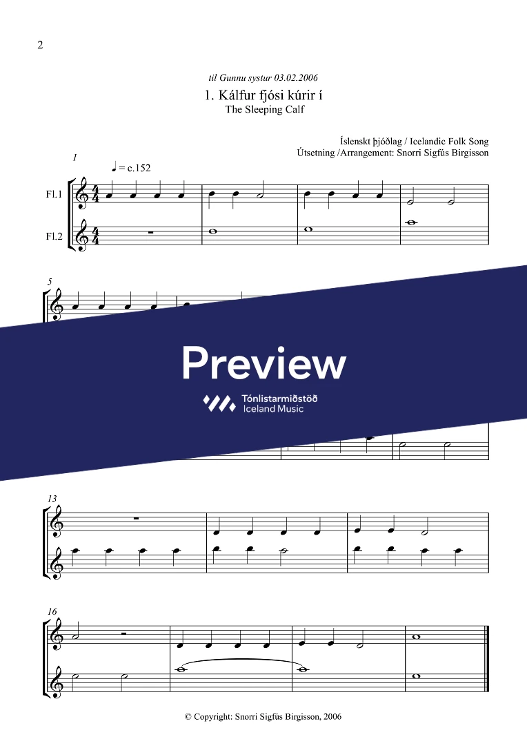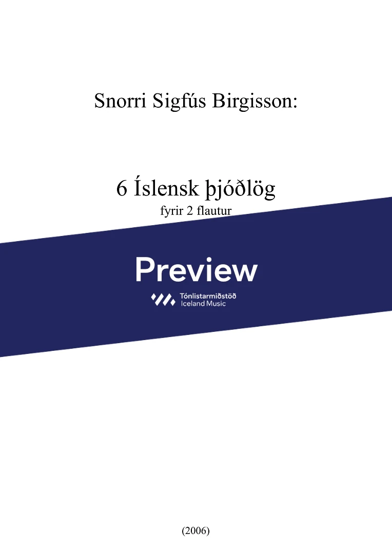 These arrangements dating from 2006 are dedicated to flutist Guðrún Sigríður Birgisdóttir. The arrangements are very simple and the upper part (Fl.1) is especially easy to play. It could easily be performed by a beginner, playing with his or her teacher.