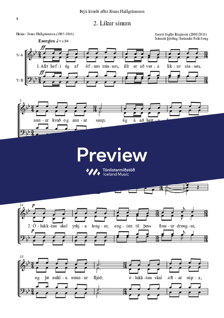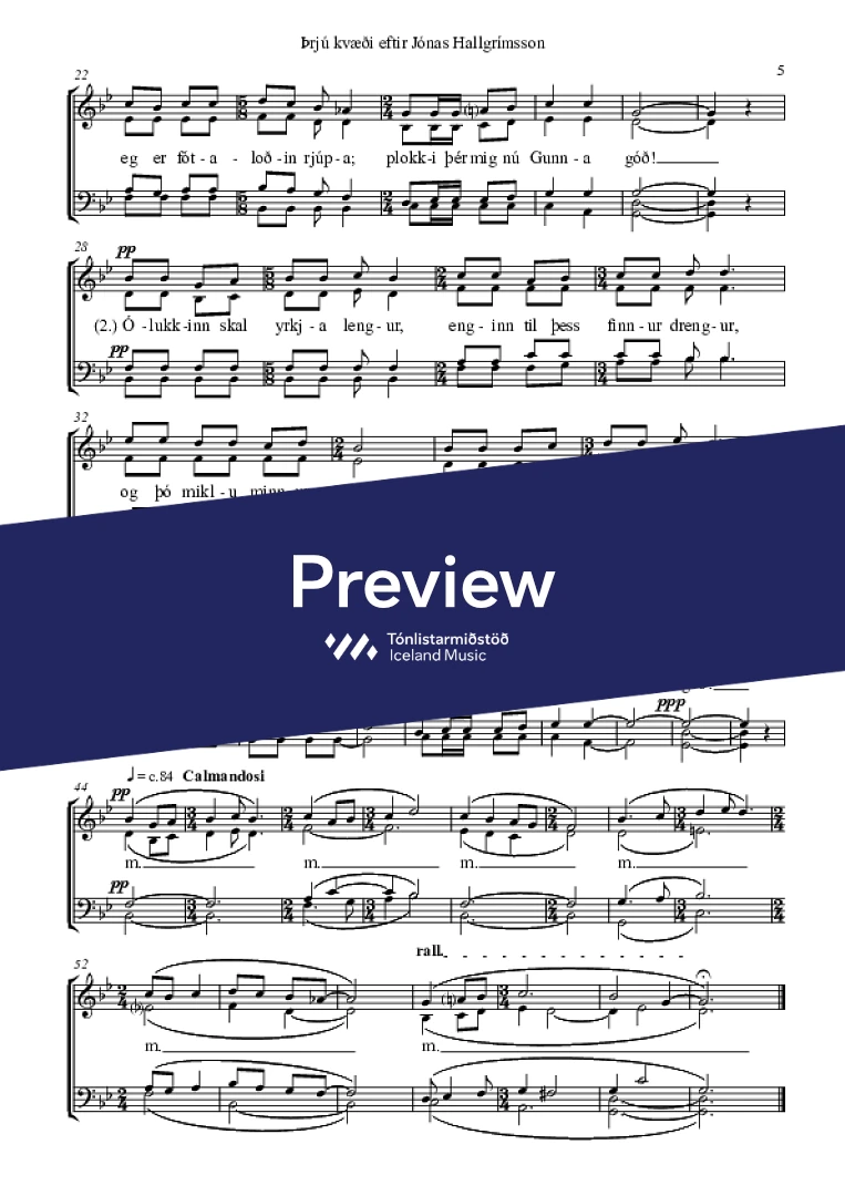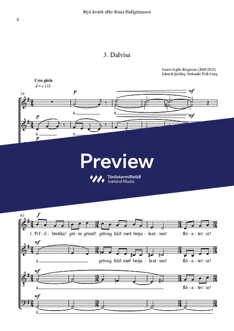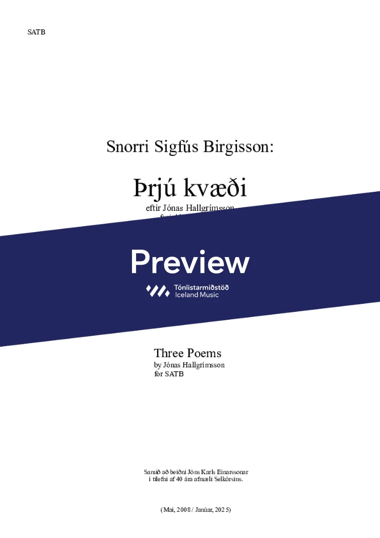 This work was commissioned by the Selkórinn choir and its conductor at the time, Jón Karl Einarsson, in celebration of the choir's 40th anniversary in 2008. It consists of three pieces (for SATB). The first is based on Icelandic folk melodies, while the other two are arrangements of Icelandic folk songs.