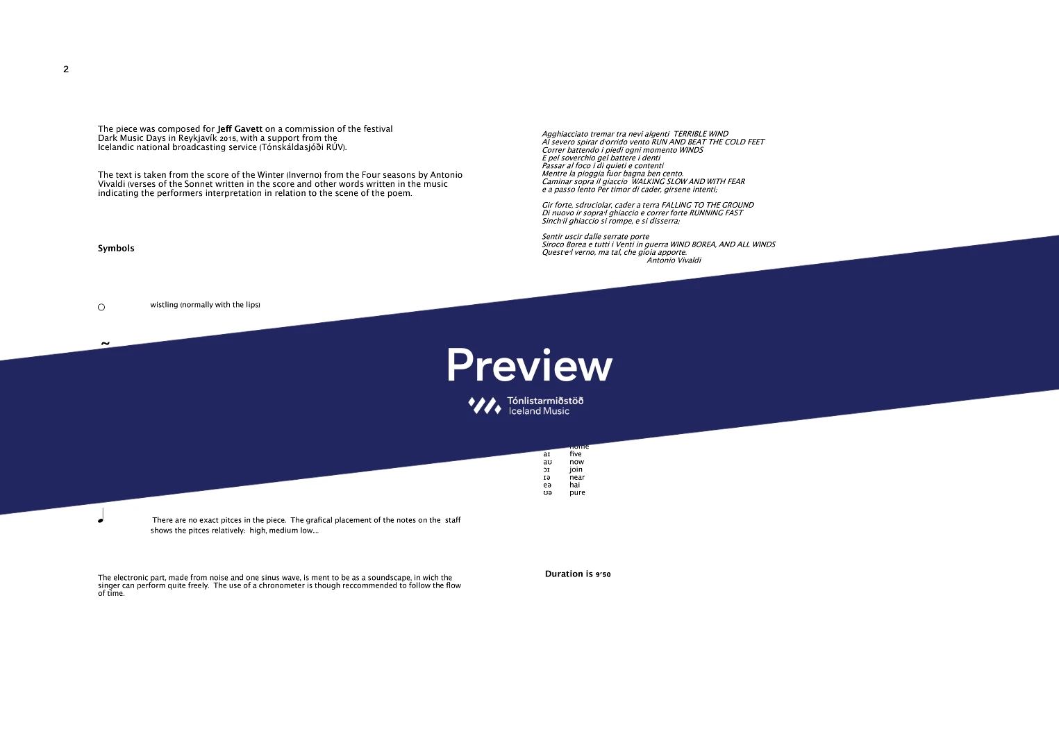 The work was somposed for Jeff Gavett and commisioned by the "Dark Music Days" festival of new music, 2015, supported by the Icelandic Radio Composer's Fund. The text is taken from Vivaldi's "Inverno" (Winter) from his "Four Seasons" for which he also wrote the texts to accompany the music.