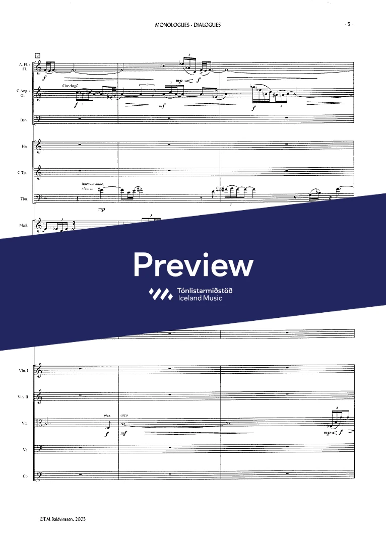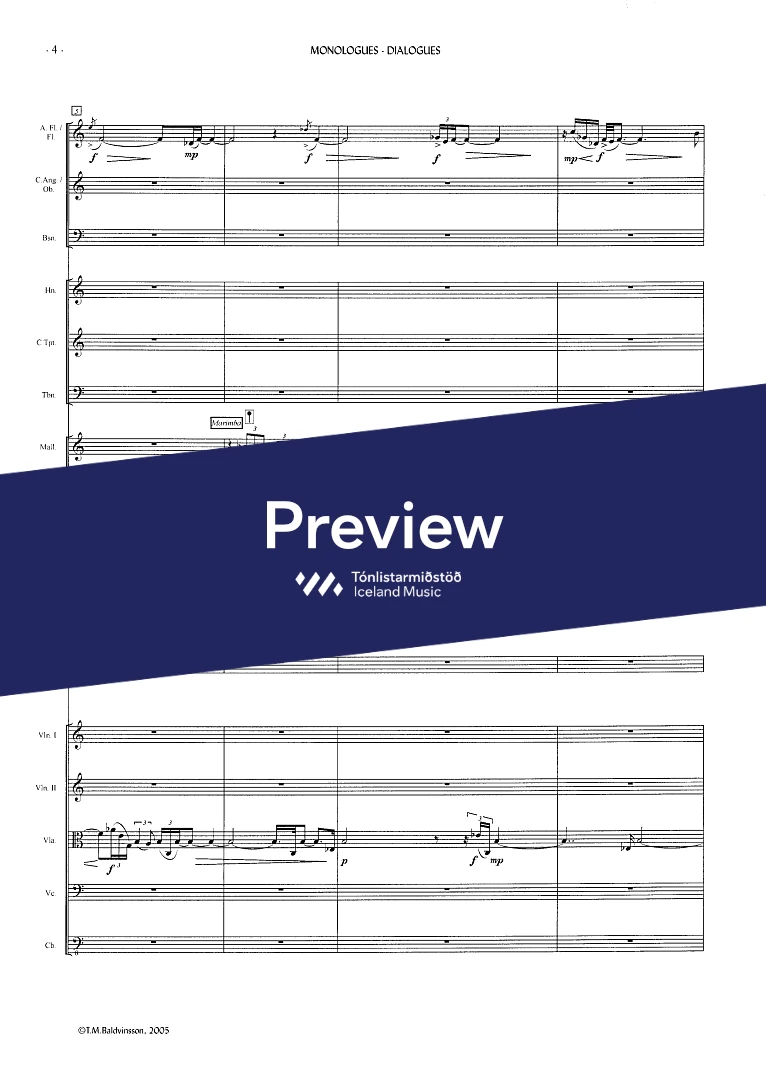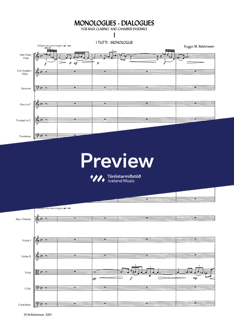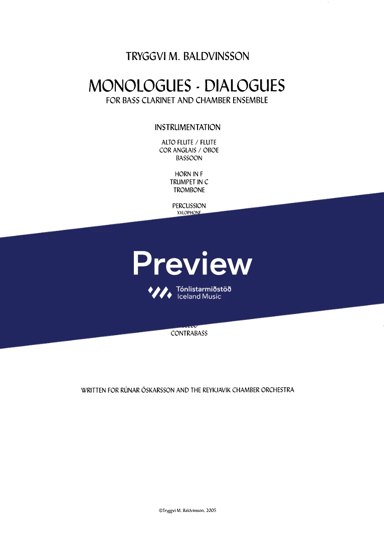 2(picc.) 2(c-ang.) 2(Eb-cl. Bcl.) 2(Cbn) - 4,3,3,1 - tmp. - perc.(2) - hp. - narr. - str.