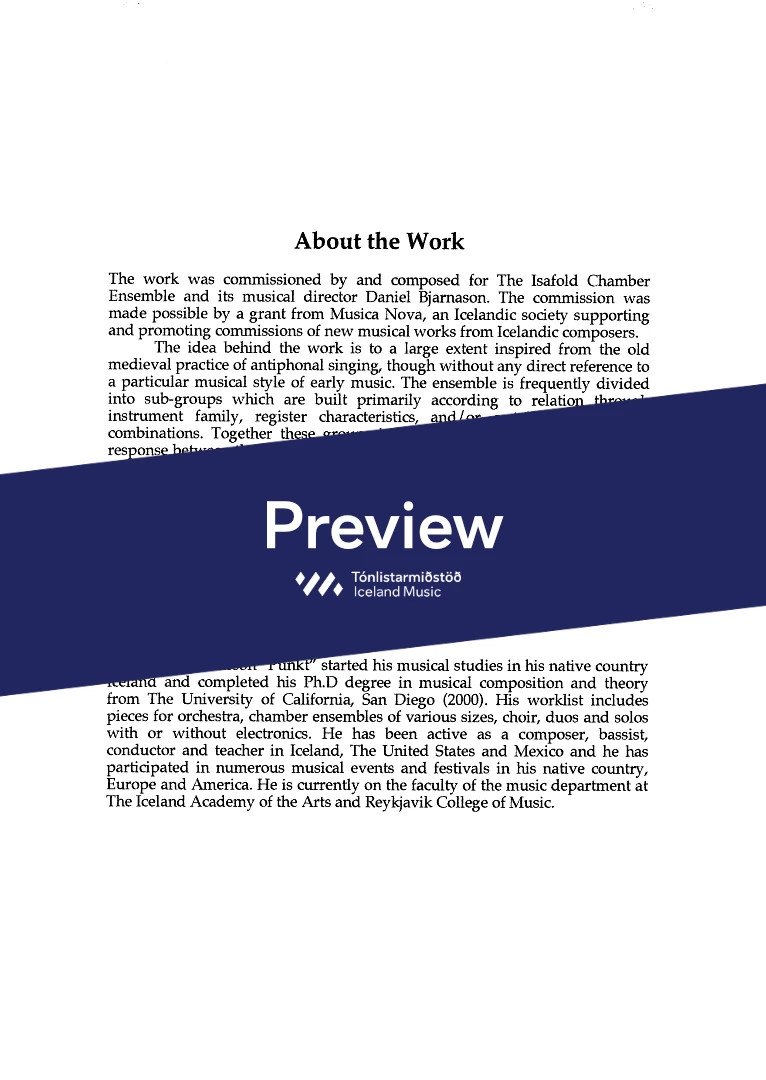 Instrumentation 1111-1111-vib-perc-harp-pno-str.(1111 or medium string orchestra)